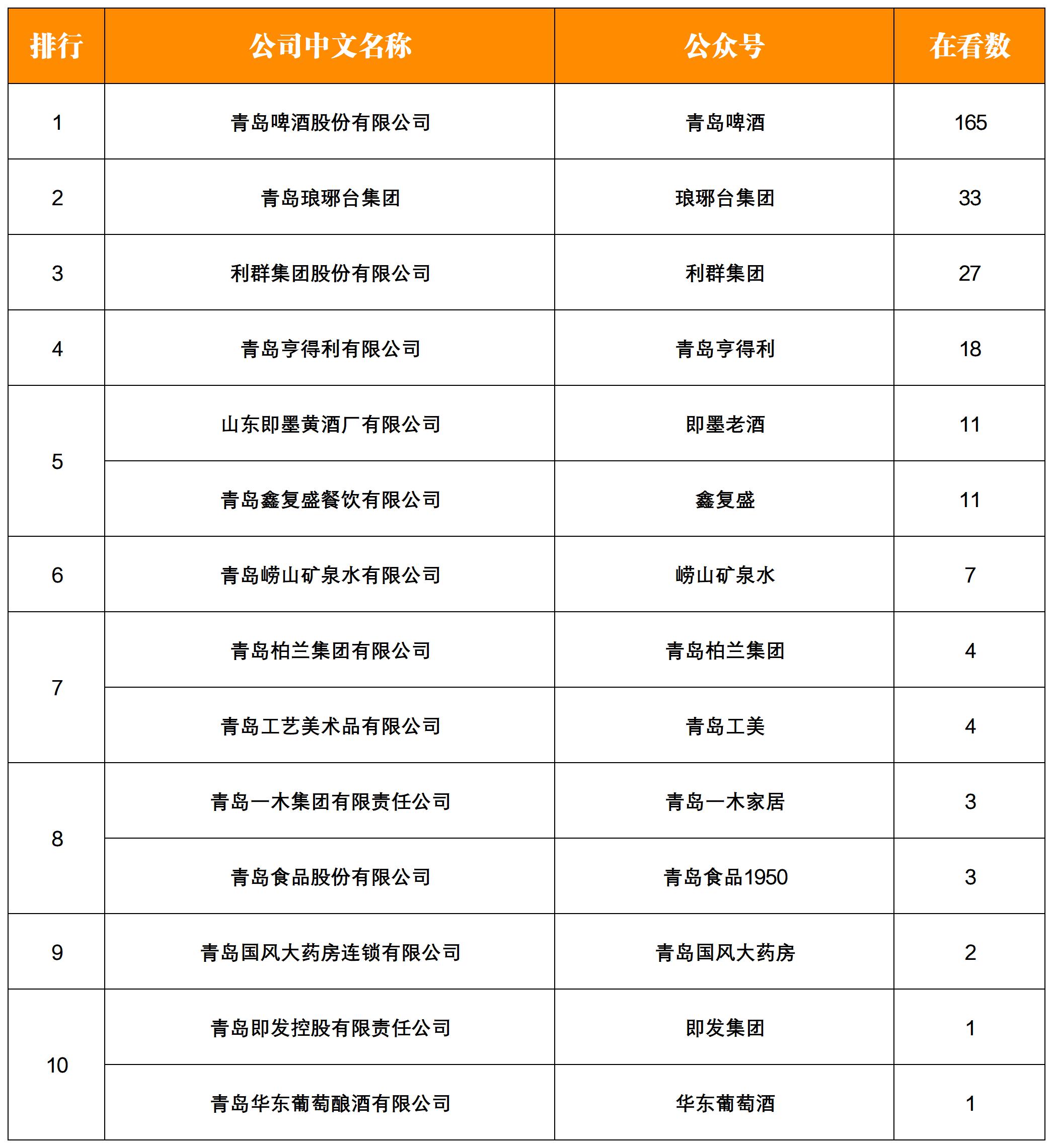 NO.10|权威发布:青岛老字号企业微信影响力月度排行榜TOP15