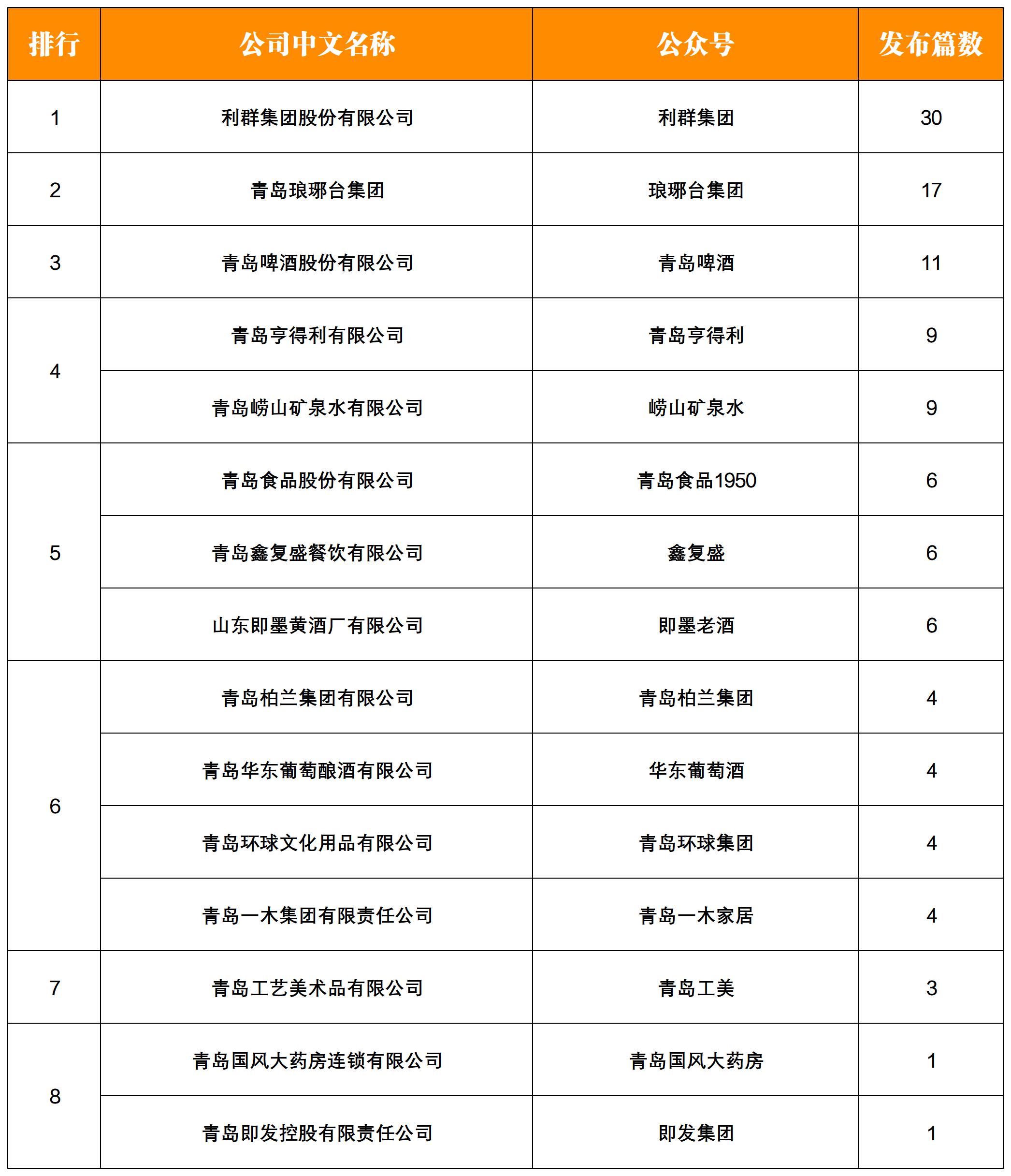 NO.6|权威发布:青岛老字号企业微信影响力月度排行榜TOP15