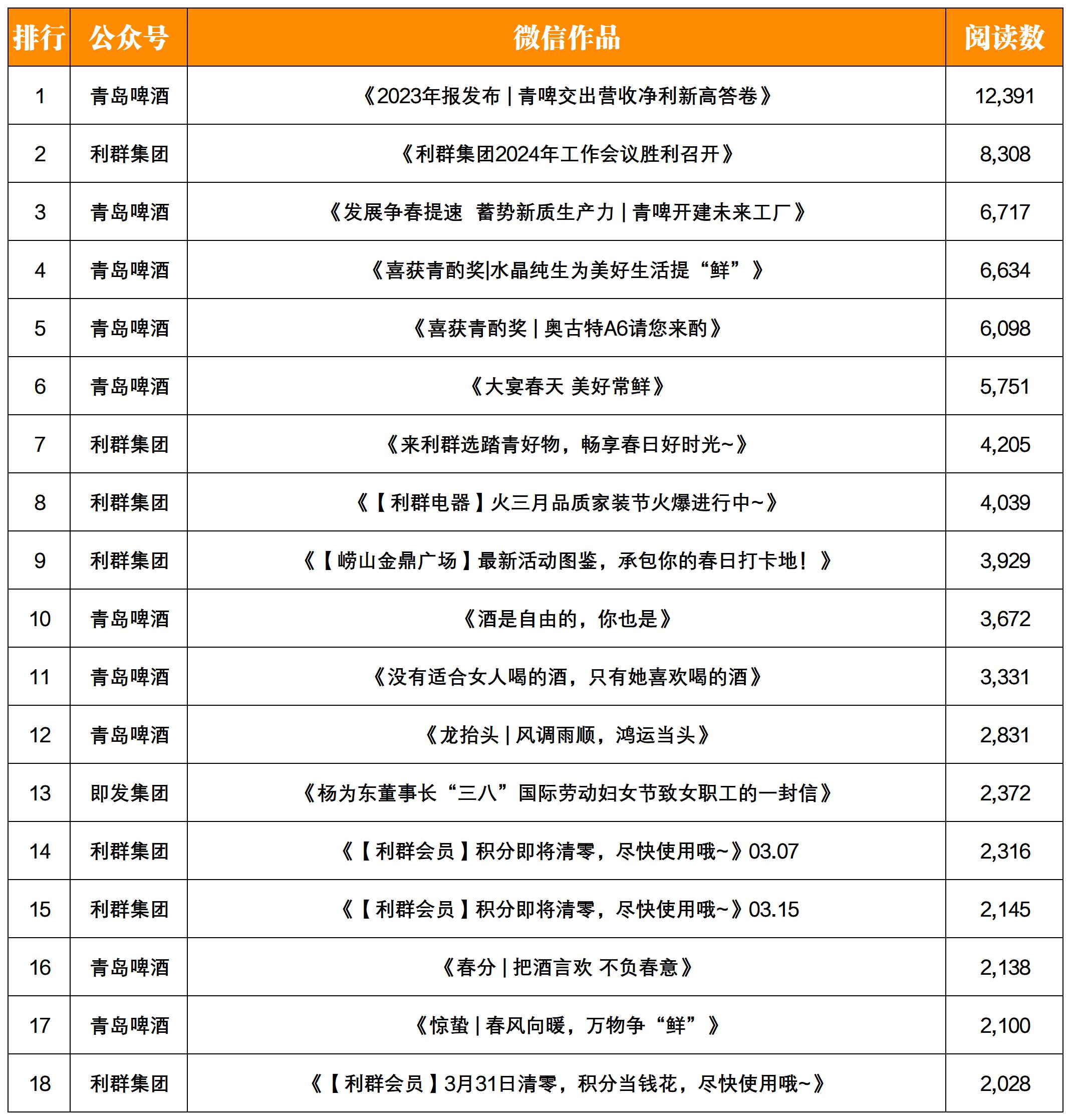 “青岛啤酒”3月份发布文章11篇,总阅读数5.2w+,经过三期后又再次夺得榜单冠军;“利群集团”3月份发布文章30篇,总阅读数4.8w+,位于榜单亚军;“琅琊台集团”3月份发布文章17篇,总阅读数9000+,位于榜单季军。