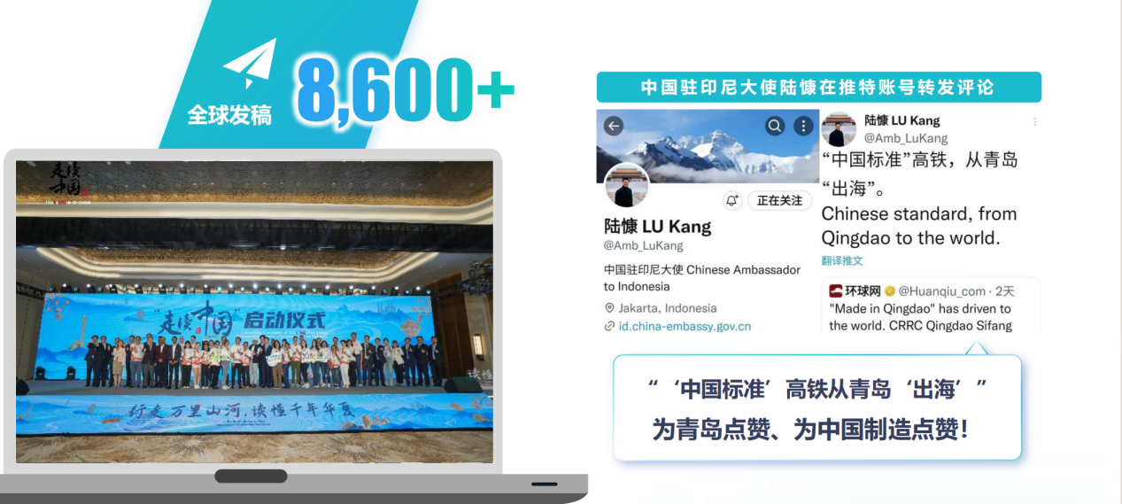 2023年5月,青岛新闻网承办了“走读中国”中外网络媒体交流活动启动仪式,并负责首站行程。来自18个国家的近30名海外媒体记者组成采访团,走进青岛啤酒博物馆、中车股份、海尔集团、东方影都等实地考察,亲身体验和记录中国文化与历史、科技的进步与社会的发展。青岛新闻网对活动进行海内外全媒体宣传推广。活动在全球平台总宣发新闻8600条,总曝光达1.5亿+,在海内外引起强烈反响,外籍记者、网红在海外平台积极推广,向世界推介青岛。同时,活动还获得了外交部及中国驻印尼大使点赞转发,得到高度认可,向世界展现了立体、全面的青岛新形象。