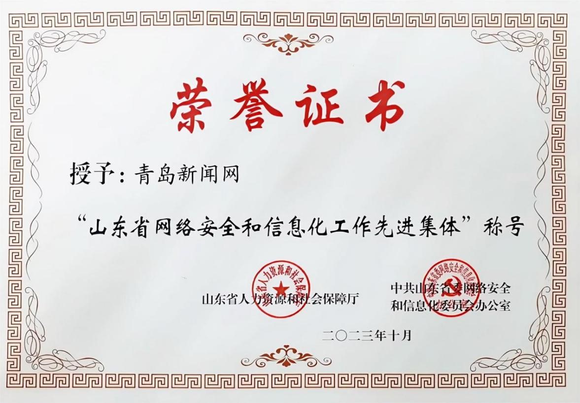2023年10月青岛新闻网荣获山东省委网络安全和信息化工作先进集体。