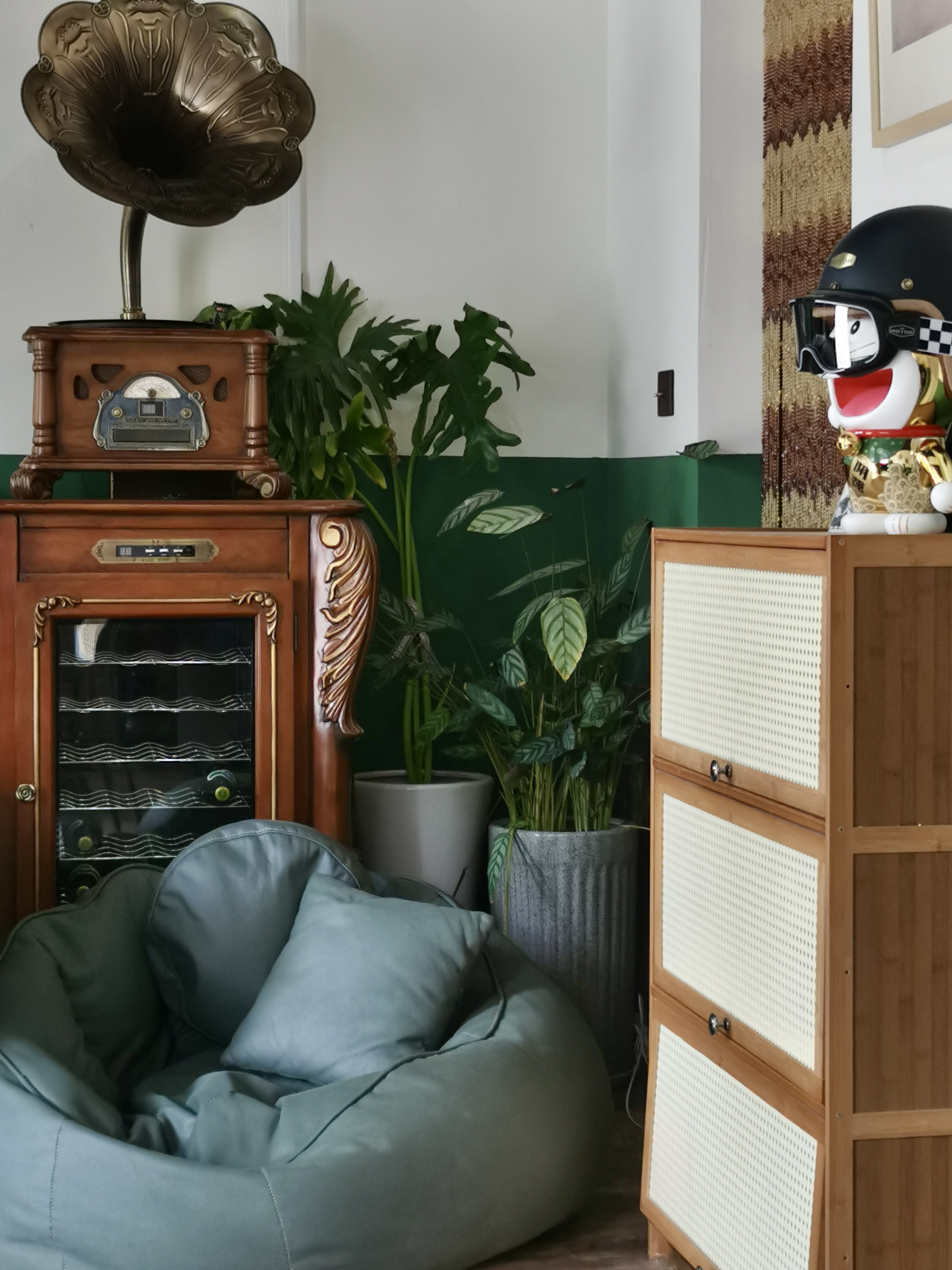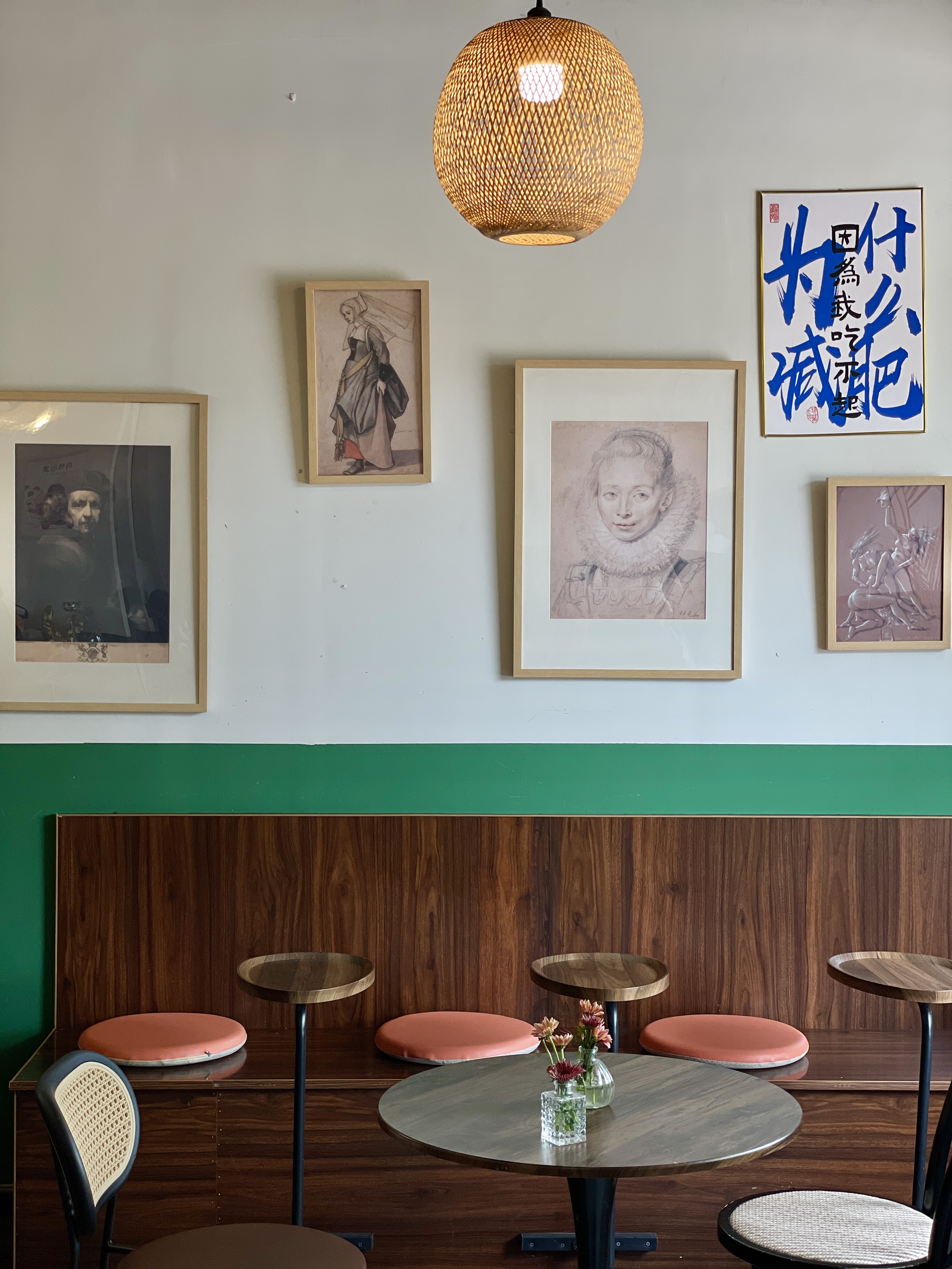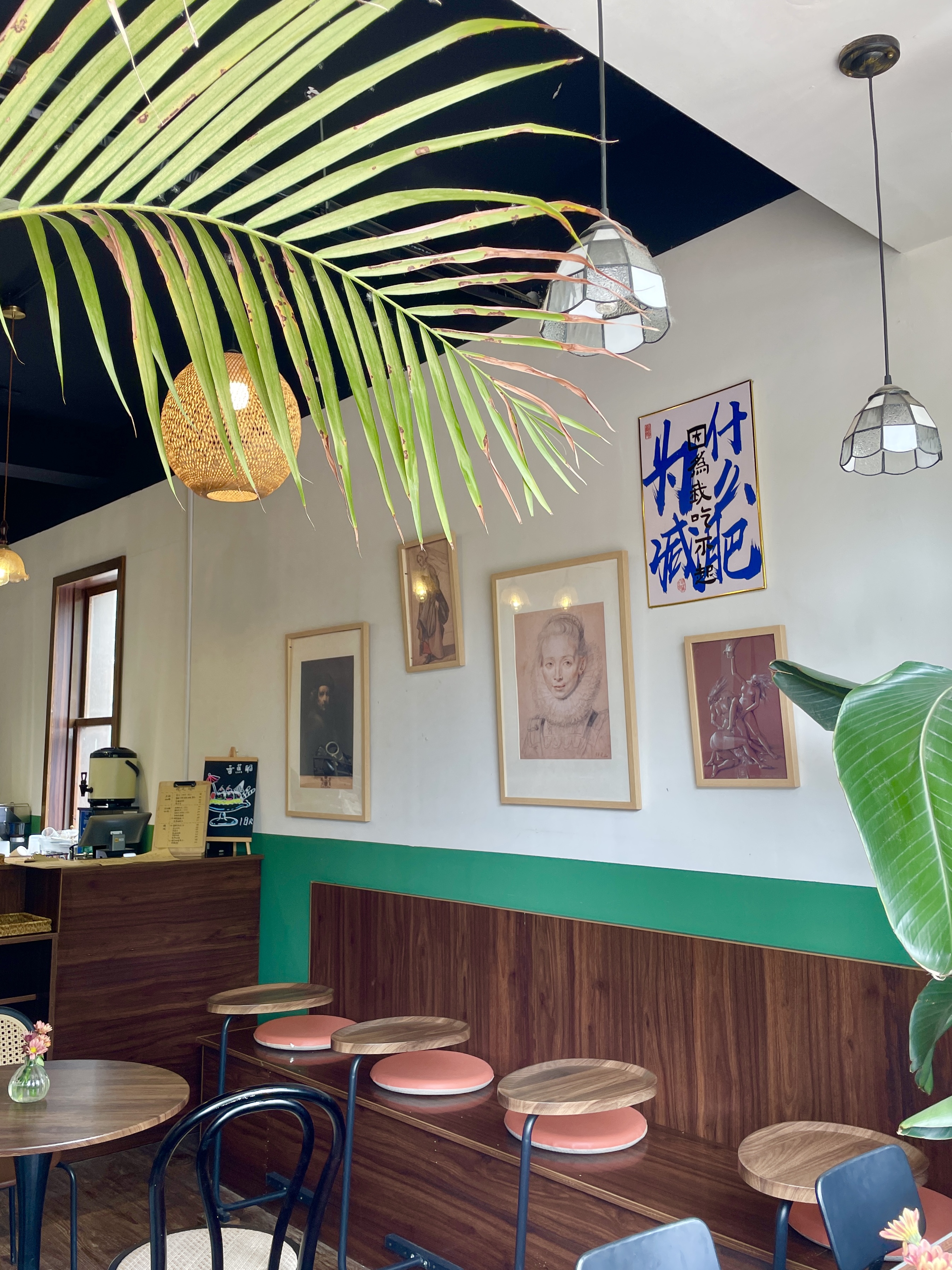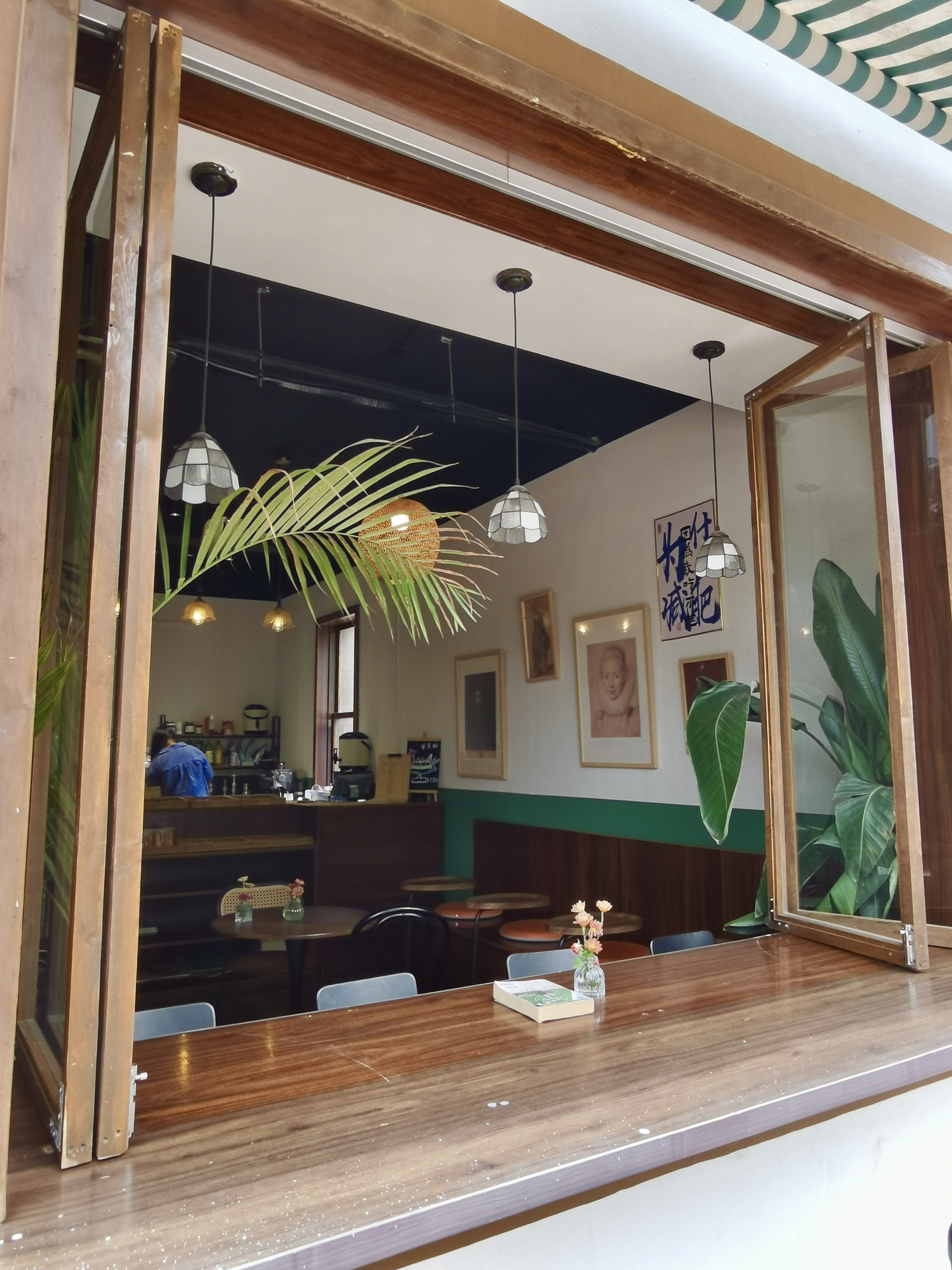 店里很多复古元素,壁画、摆件、灯饰......很有格调,还有一面超大的开放式窗户,面河而坐,安静读会书,身心愉悦。