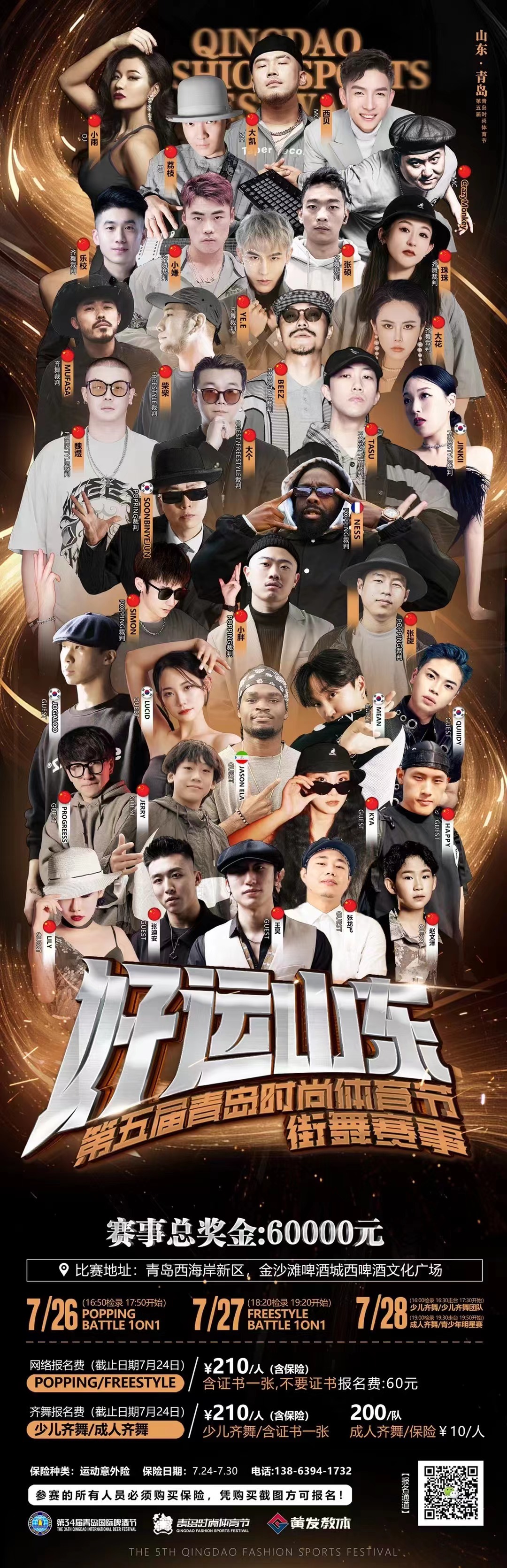 舞力全开、决战巅峰!此次青岛时尚体育节国际街舞大赛我们邀请到了来自法国的世界街舞冠军大满贯popping神级大师NESS;韩国超强街舞新生代战神SOONBIN;力量与美的完美融合waacking女神Jinkii;明星演艺人MEAN、风格舞者Jogaloo、Lucid和Quiiidy;来自赤道几内亚的Hippop嘉宾Jason及圈内多位国际级街舞裁判与嘉宾进行比赛判罚与表演,史诗级裁判阵容空前绝后,为大赛提供专业性的有力保障。更有来自Cruise Staff 娱乐部的专业DJ-LITCHI与中国街舞国家队locking代表队成员-CRAZY MONKEY做为MC强强联合,用劲爆的音乐与专业的解说来点燃现场气氛,掀起青春浪潮,引爆夏日激情。还有神秘的裁判秀给市民游客一场精彩的视觉盛宴。