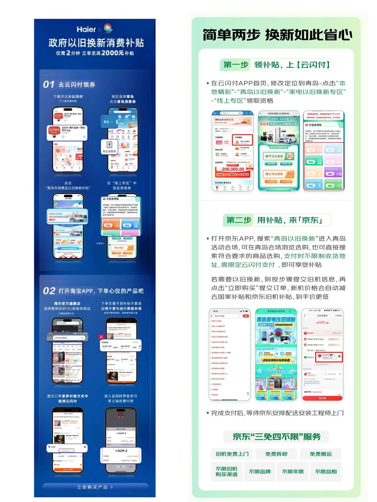 9月9日上午10时起,海尔智家联合青岛市政府、市商务局打造的线上以旧换新补贴领取专区,在“云闪付”APP正式上线。各地用户领取家电以旧换新消费券以后,就可以通过海尔集团电子商务有限公司在淘天、京东等电商平台开设的各类店铺下单活动产品,如海尔/卡萨帝/Leader官方旗舰店、京东自营旗舰店和品类旗舰店。用户可享受减免产品金额15%(针对二级能效产品)或20%(针对一级能效产品),单品最高2000元的补贴权益,覆盖的品类包括冰箱、洗衣机、电视、空调、热水器、吸油烟机、家用灶具等。