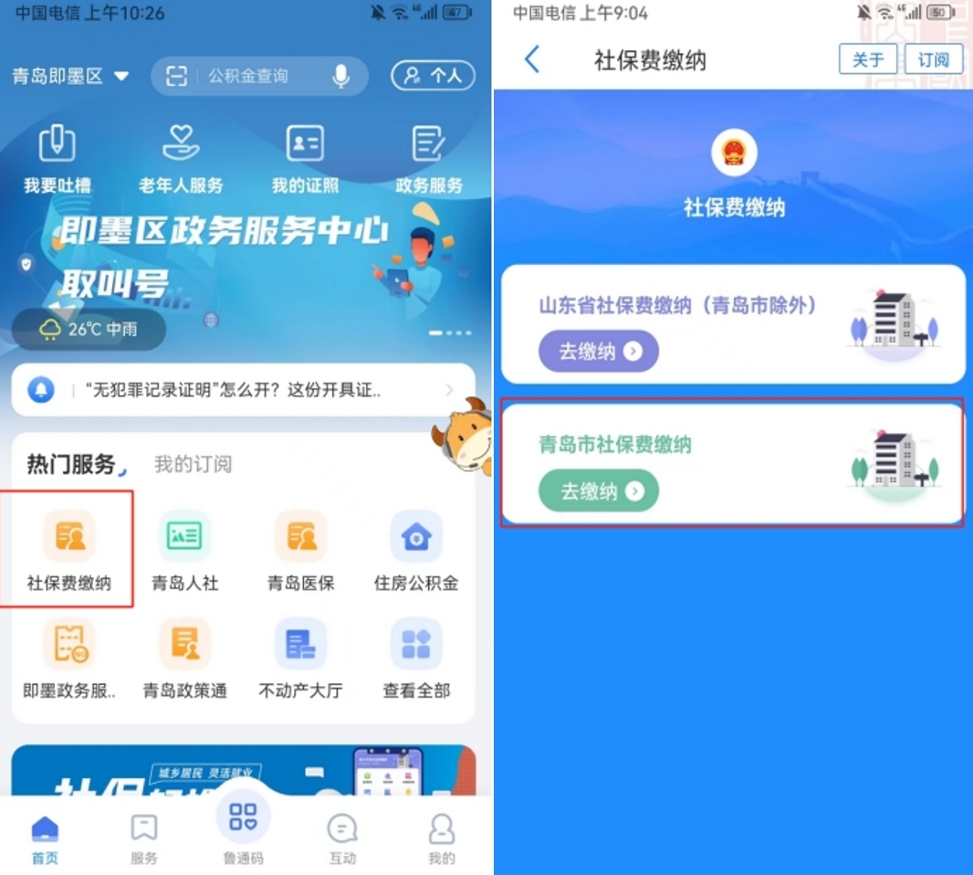 1、以“爱山东”APP为例,打开并登录“爱山东”APP,左上角切换至“青岛即墨区”,首页推荐应用区点击“社保费缴纳”直接进入服务(或可通过搜索应用名称进入);
