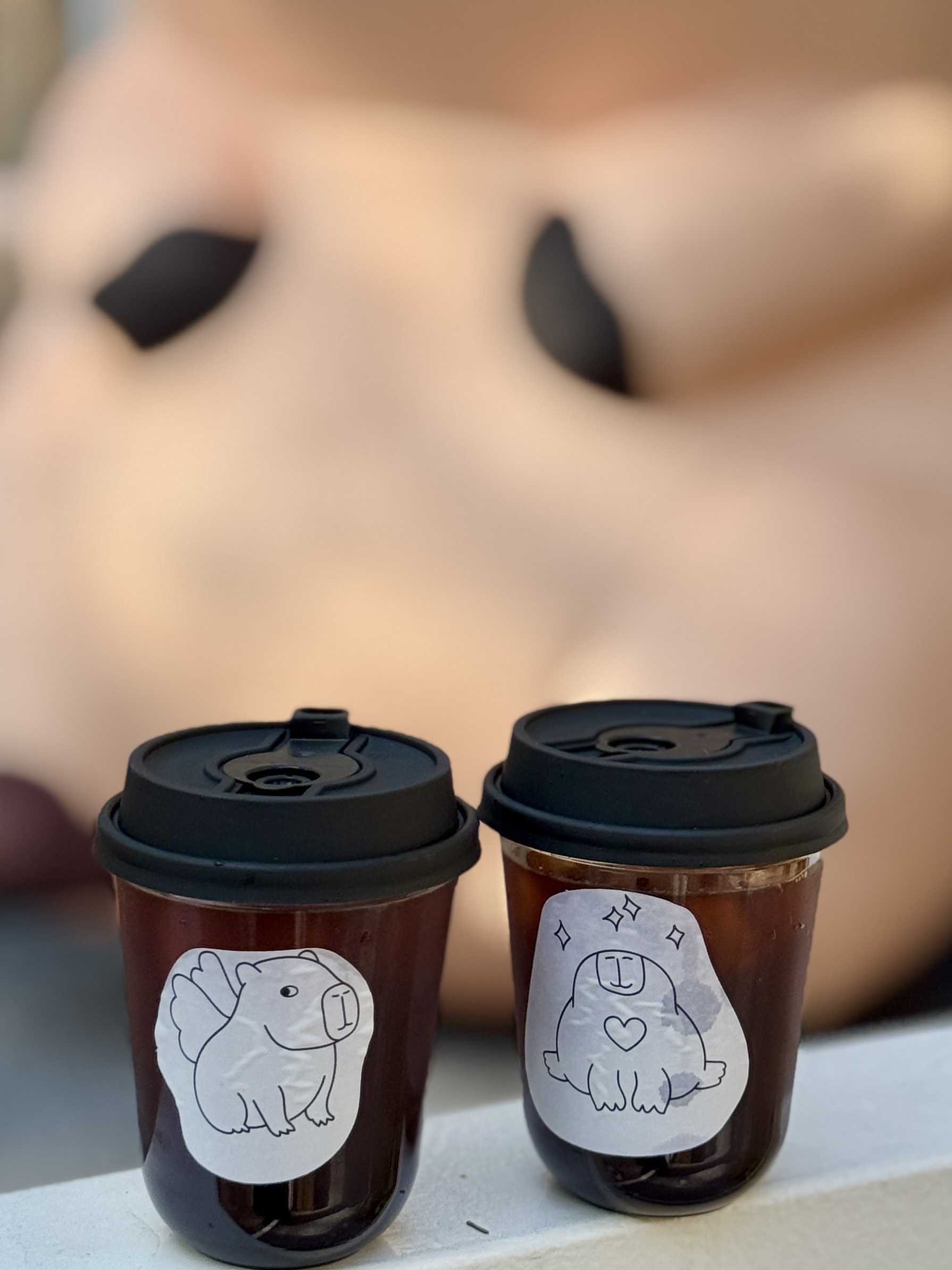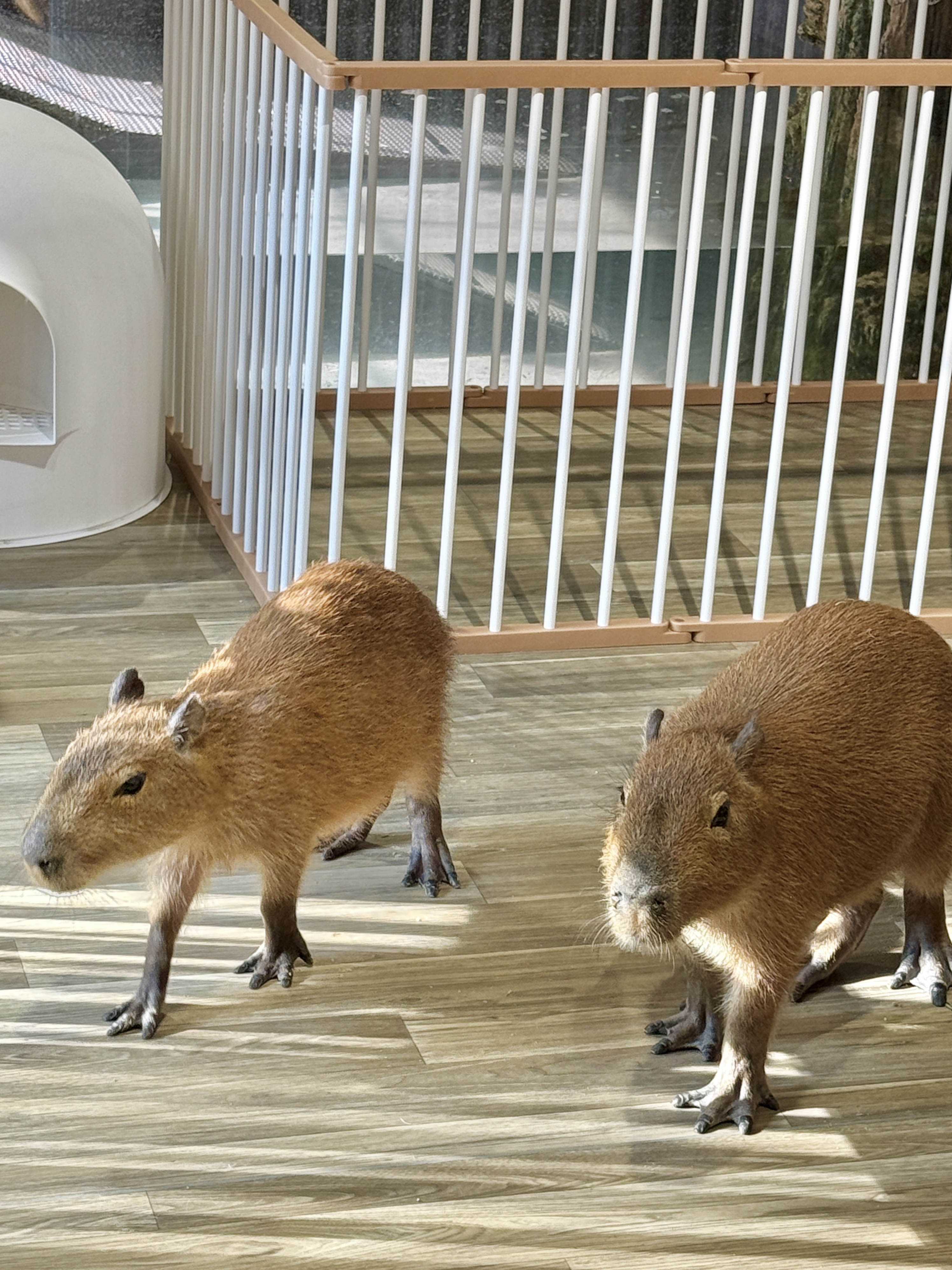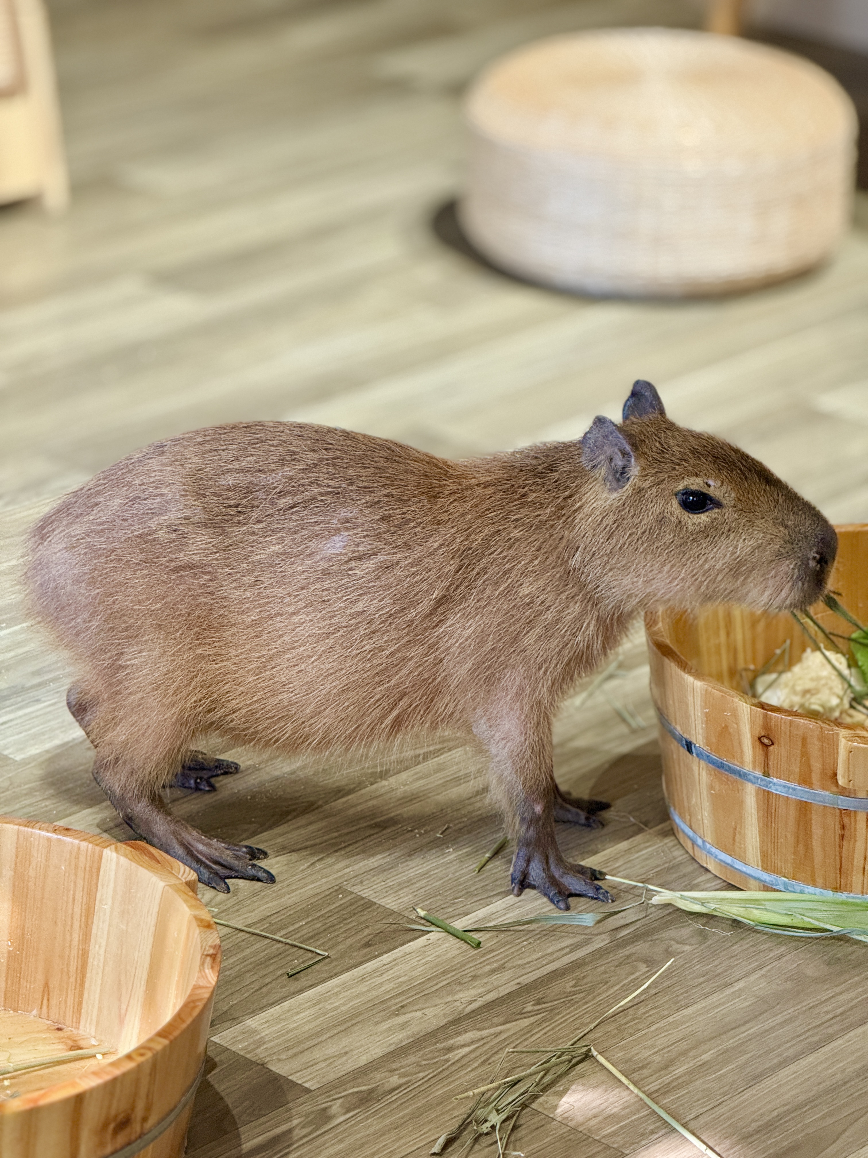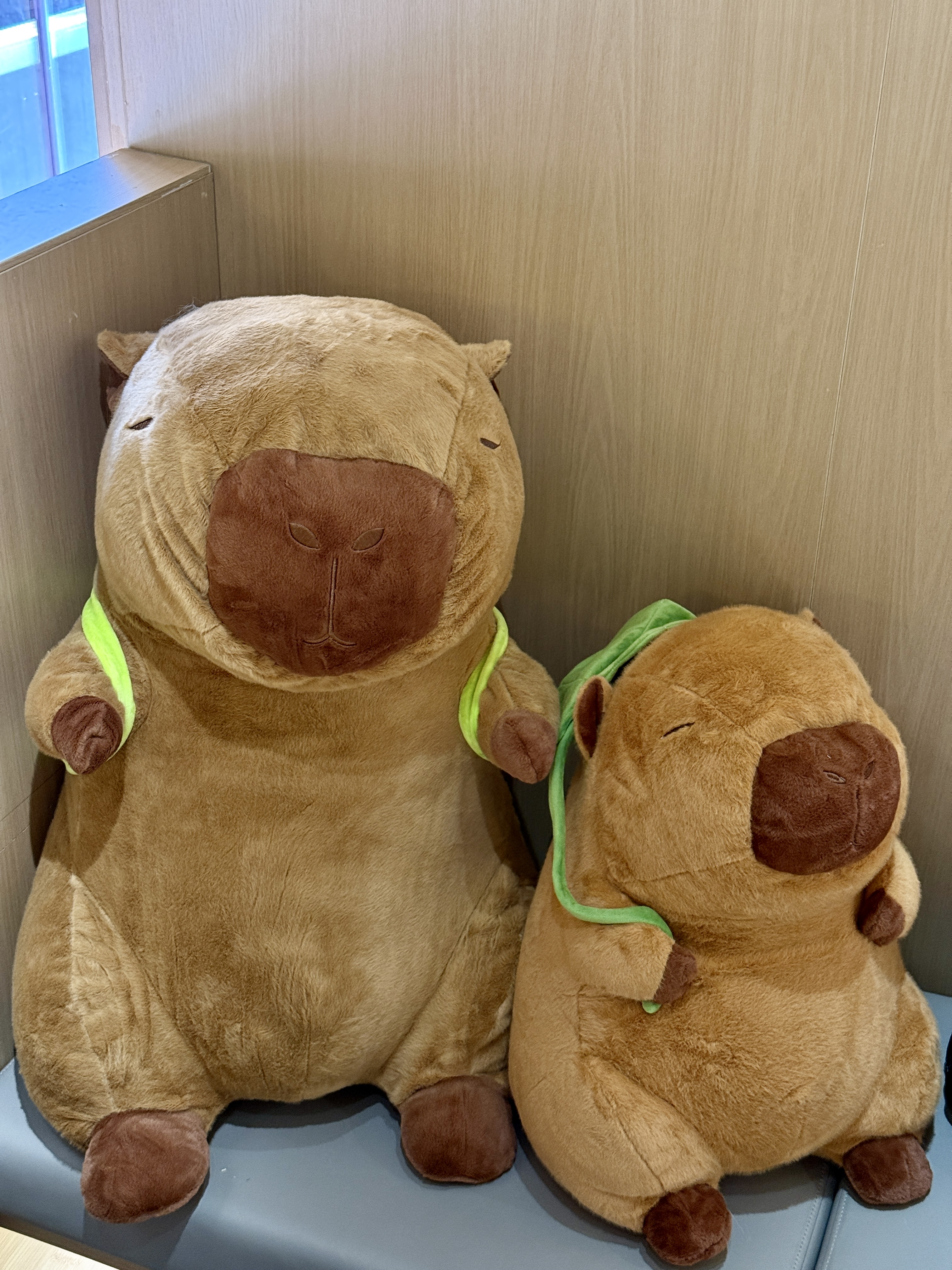 近距离观察,真的很呆萌,不愧是动物界的松弛感新顶流。店内有很多卡皮巴拉造型的玩偶公仔、水杯,喜欢都可以买走。除了卡皮巴拉,店内还有超多小猫咪,软萌亲人。店内购买甜品还会赠送蔬菜包和猫罐头,可以投喂四脚兽们。