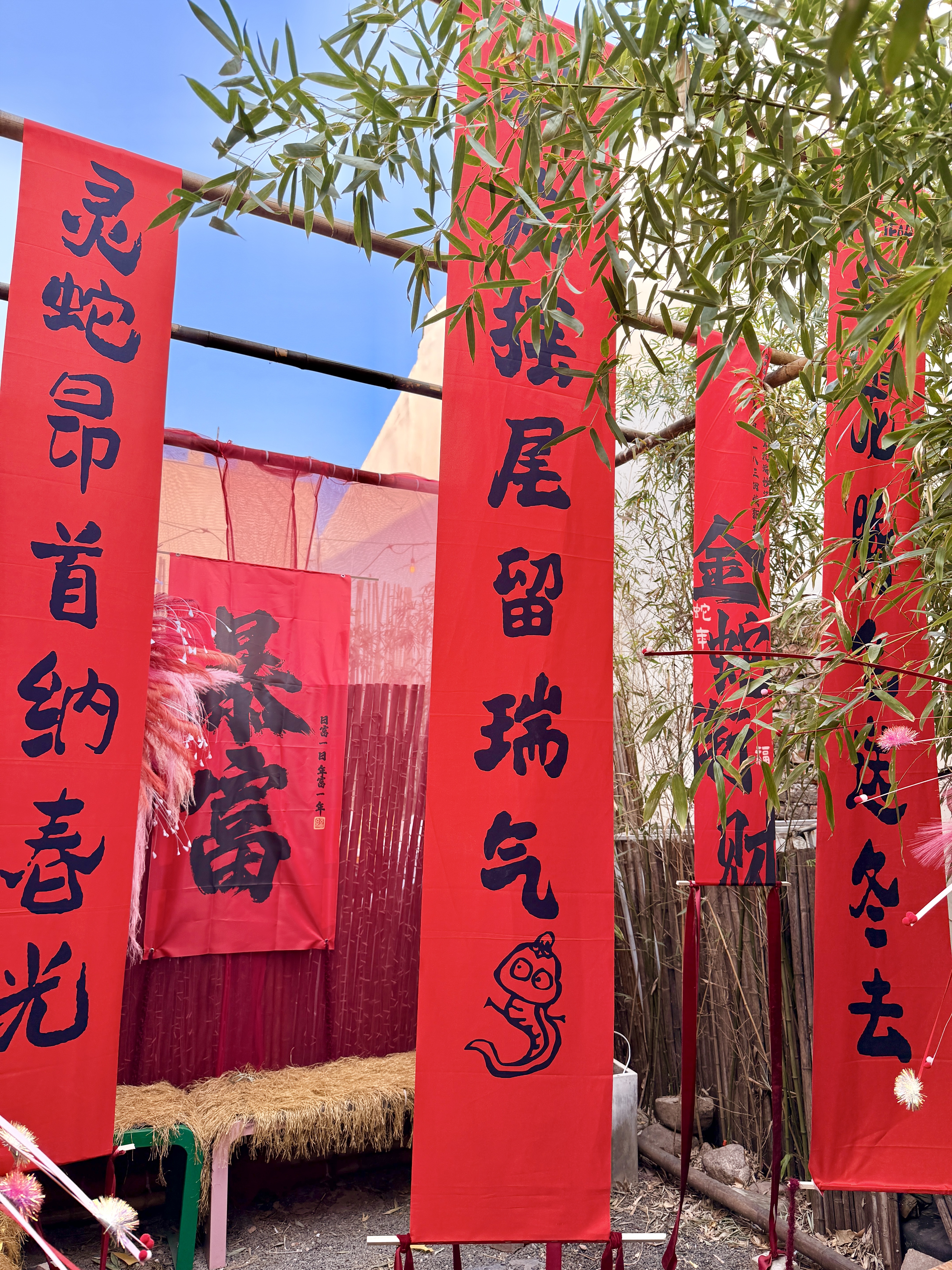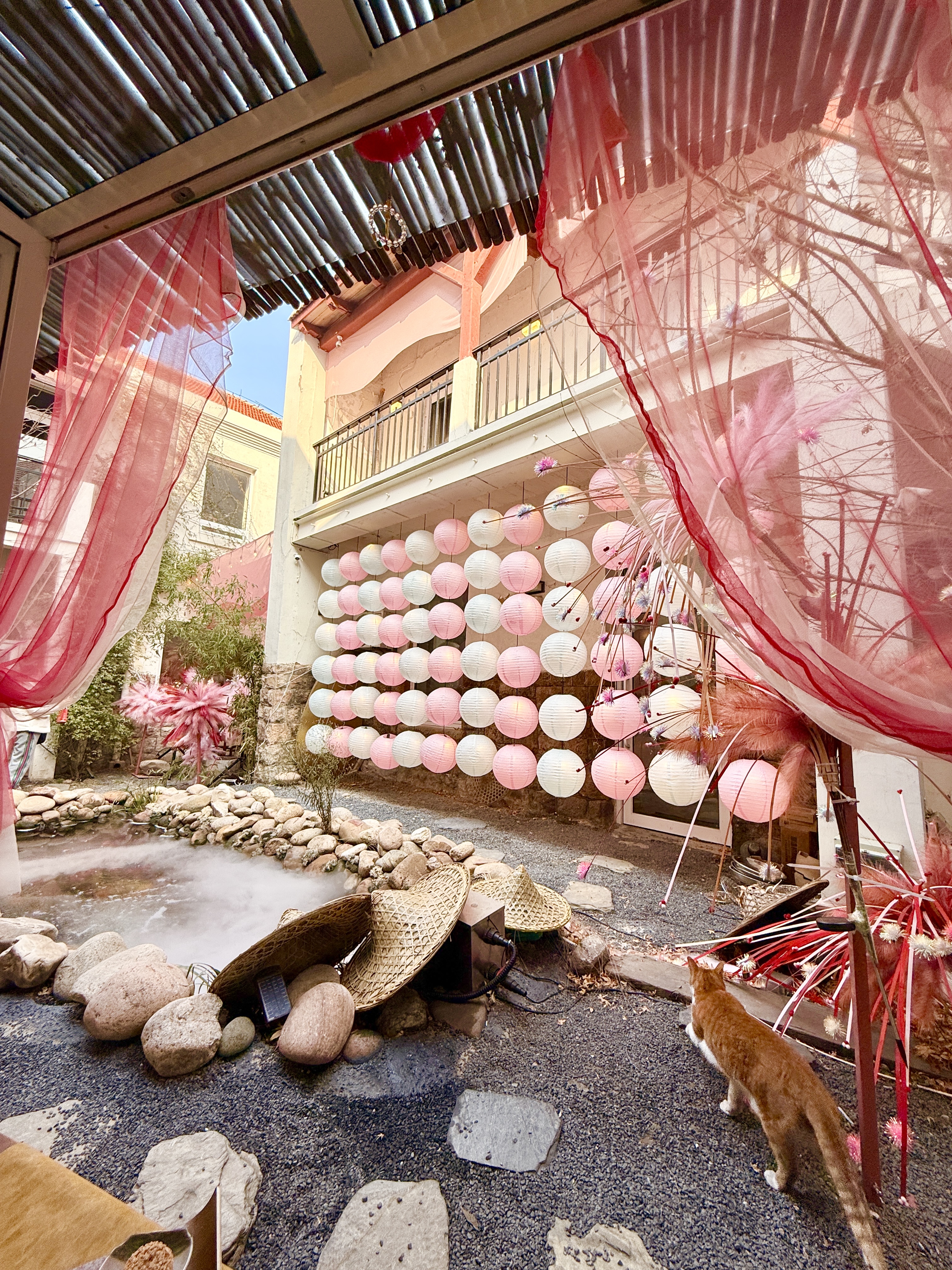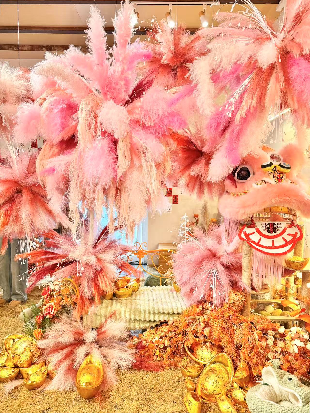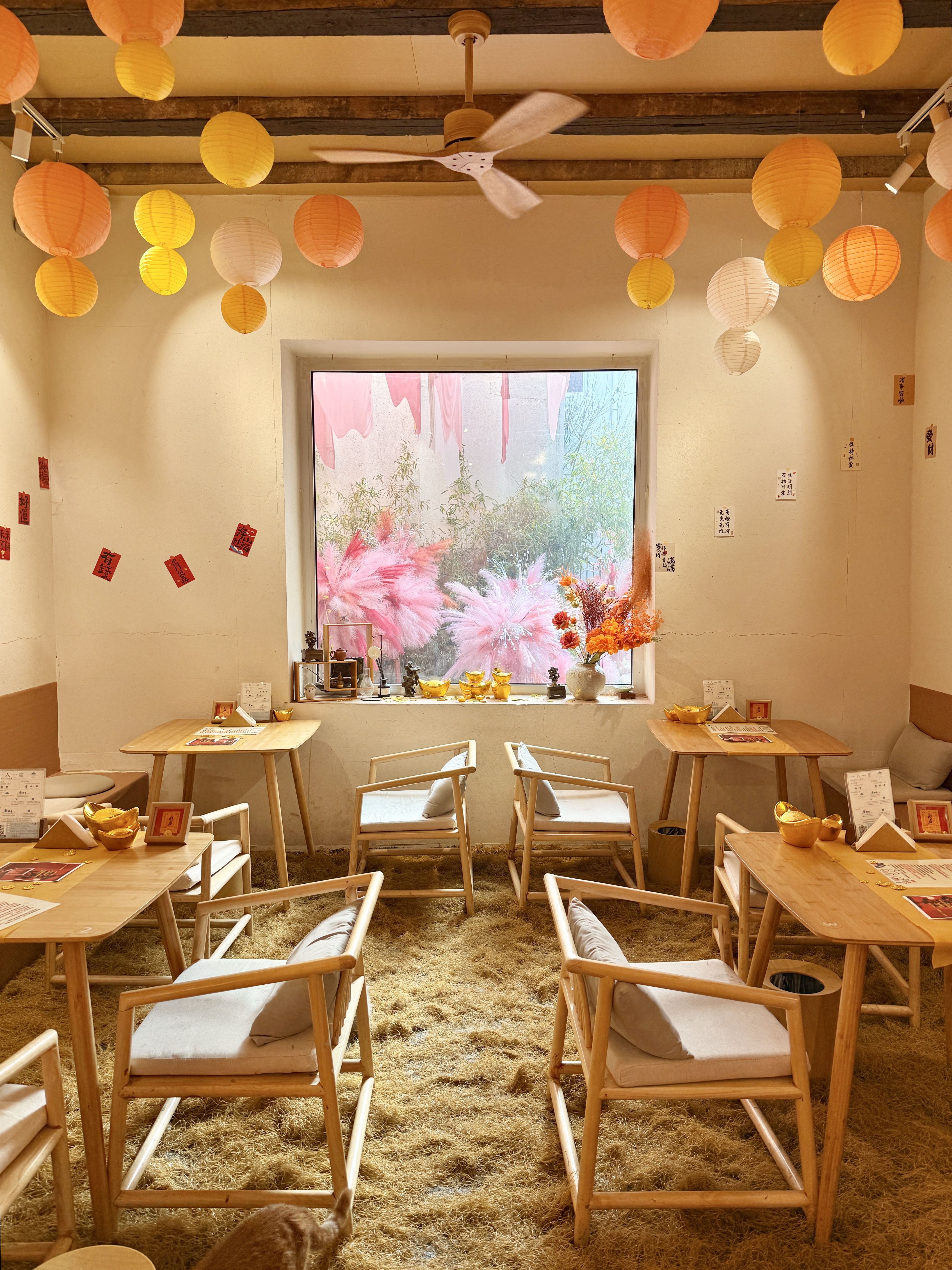 从室内到庭院全都是粉色系的新春装置,院落一隅还有春联,复古又清新,店里的喵主子们也盛装出席,都预备备好,准备提前过年啦!