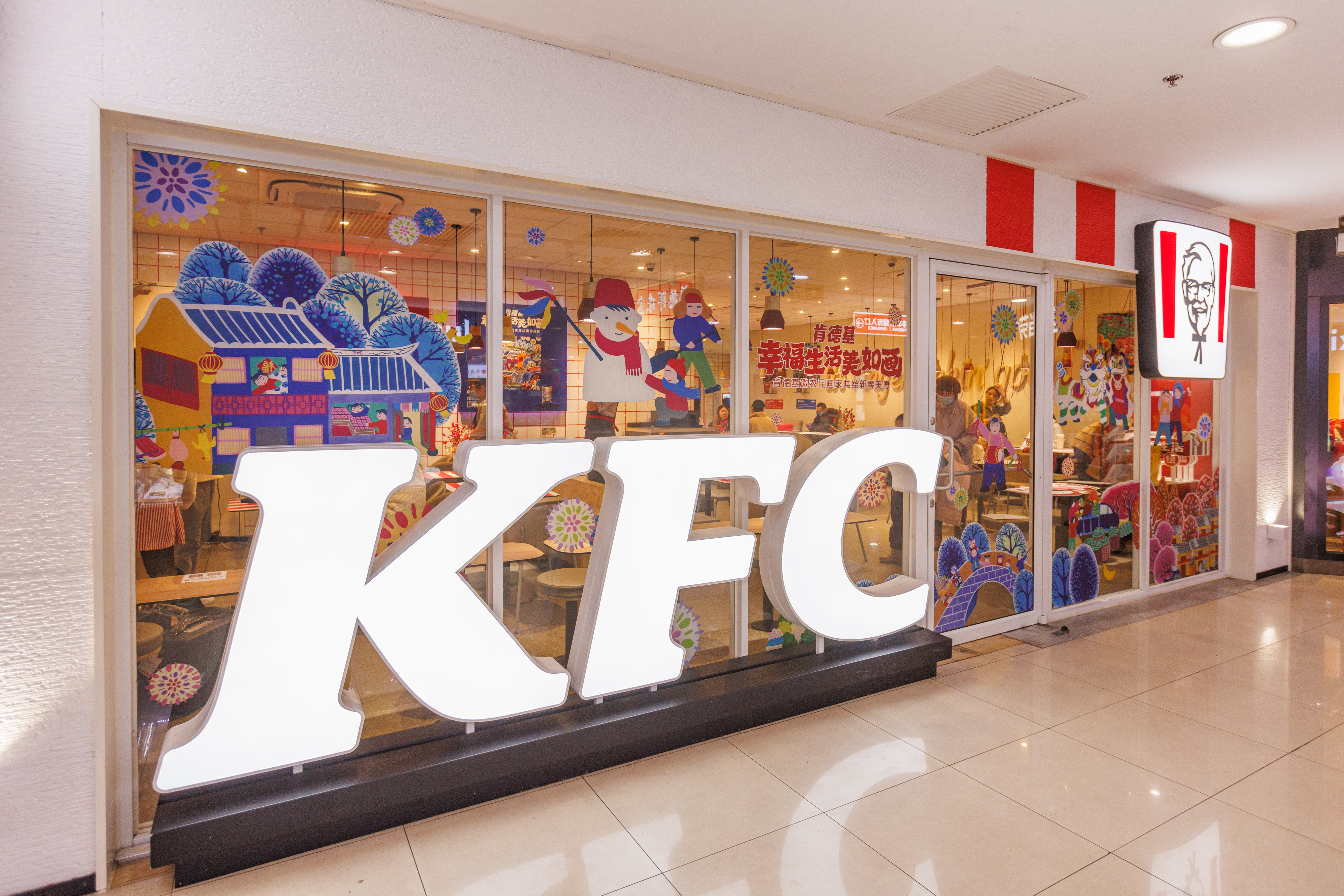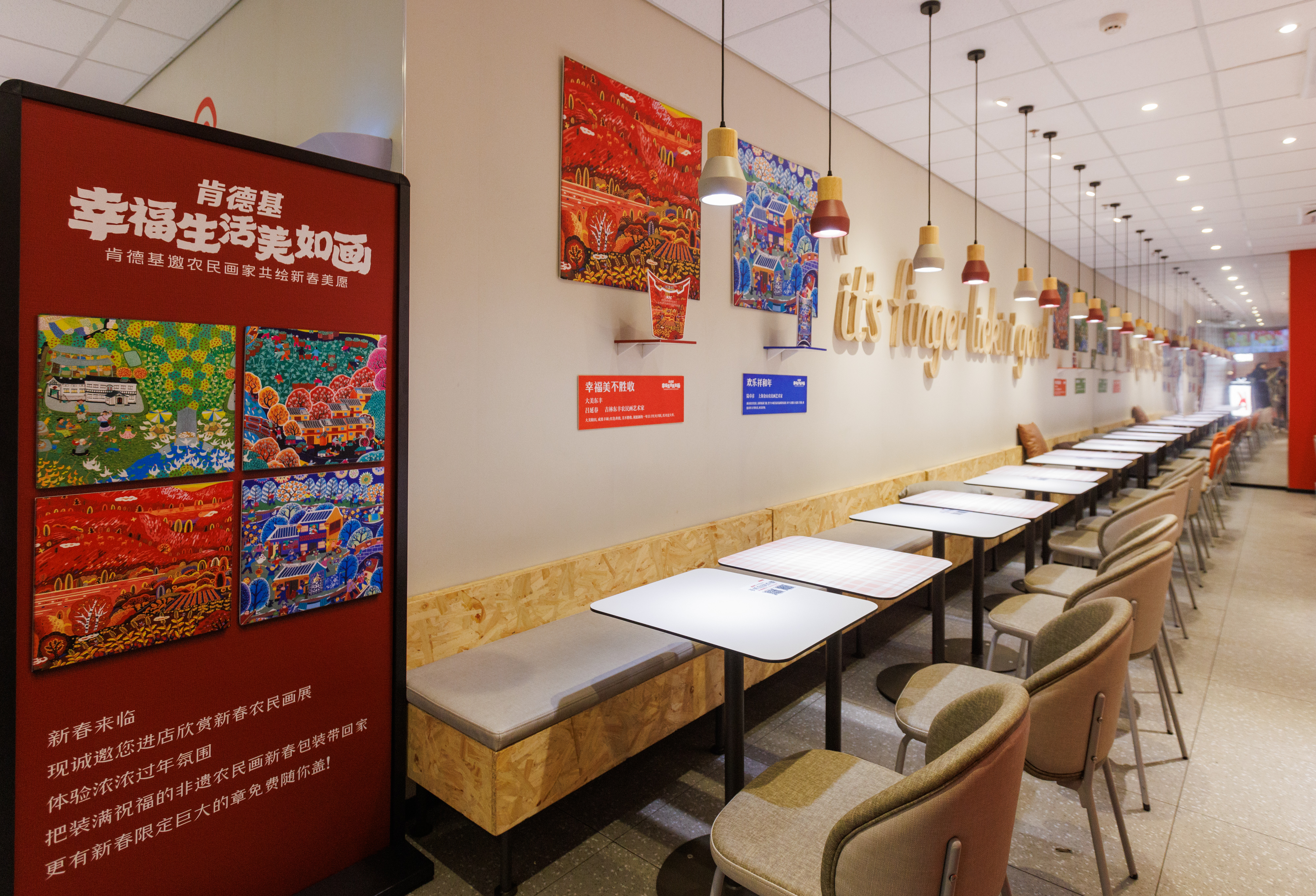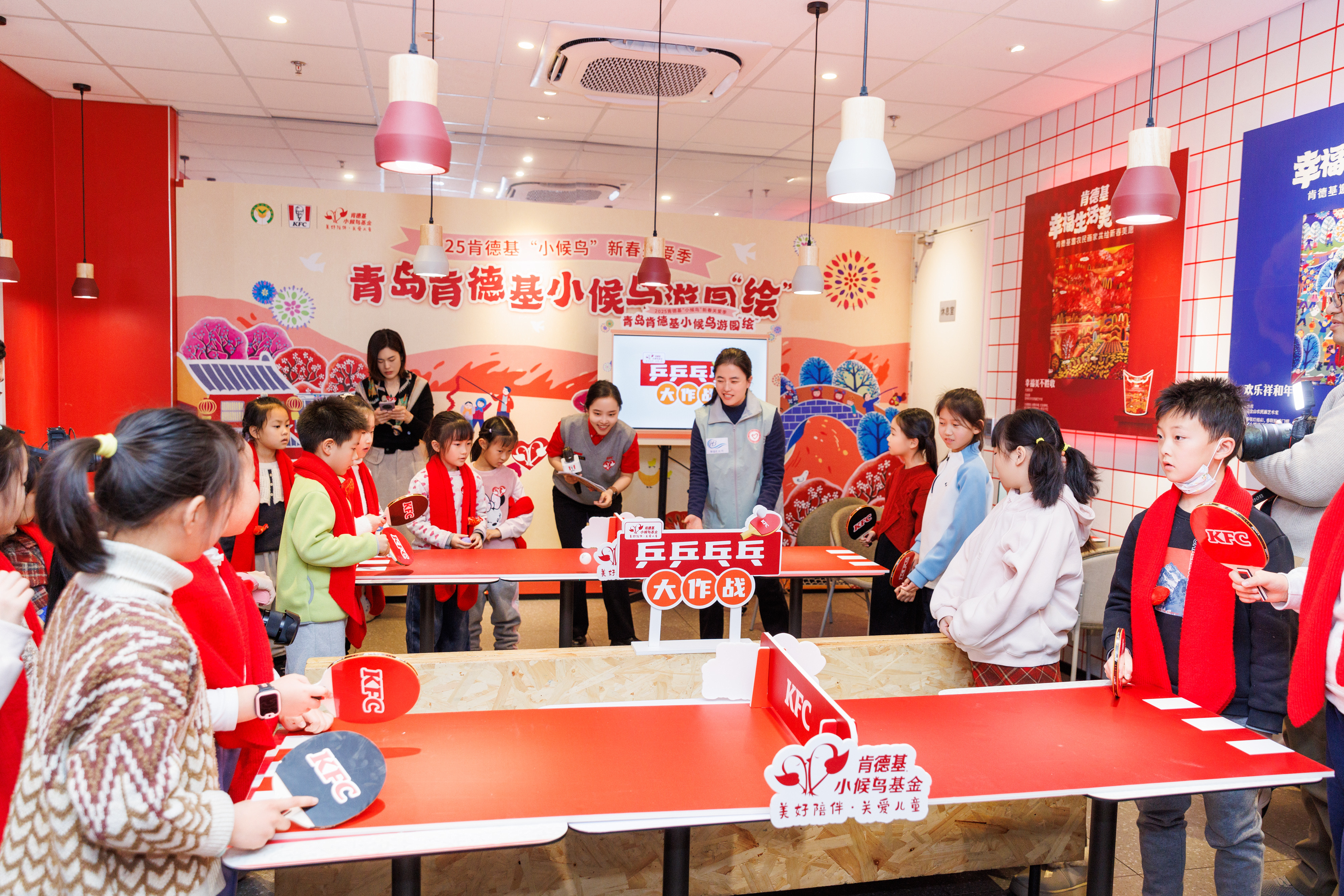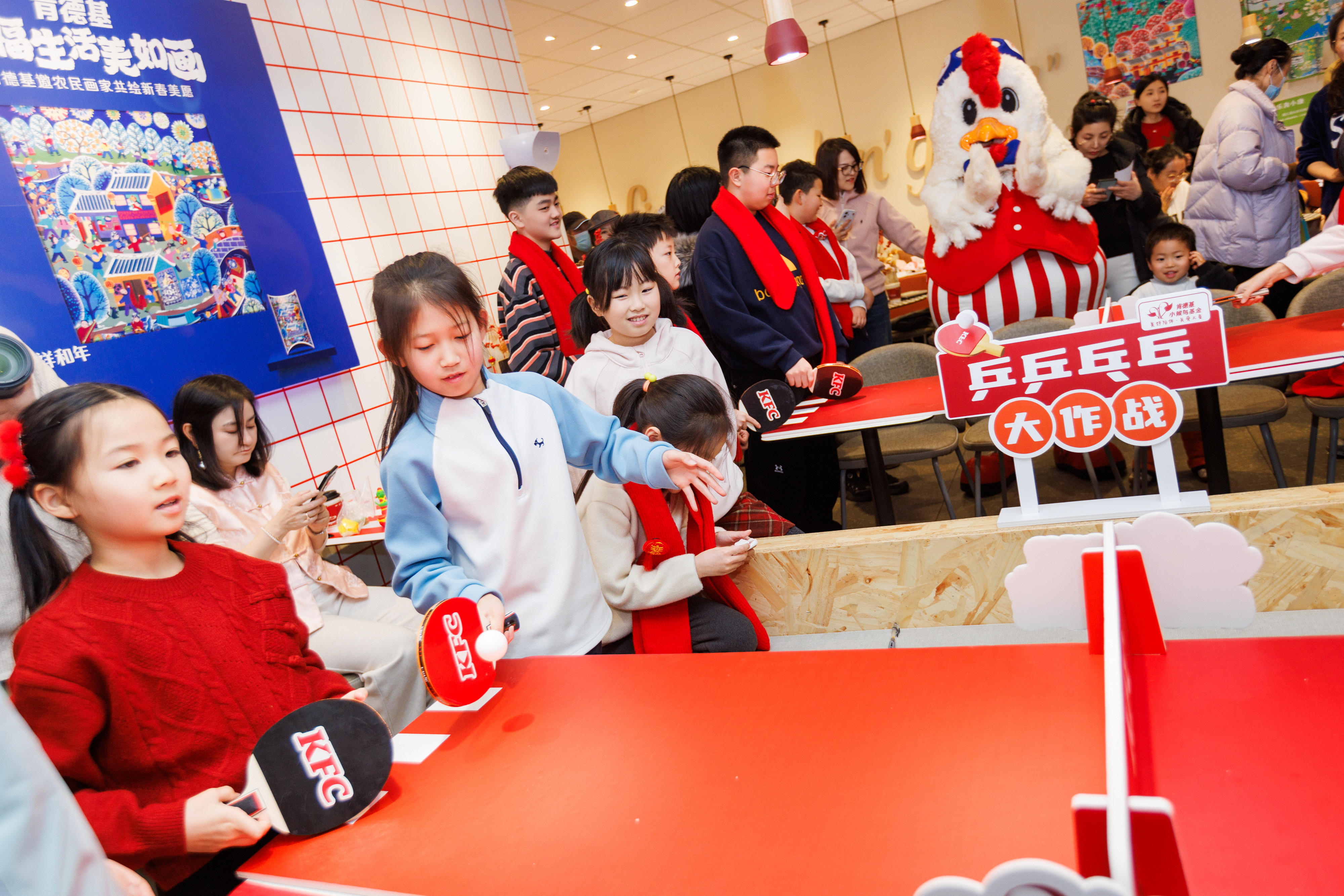在肯德基农民画主题餐厅里,大朋友、小朋友们与孙颖莎立牌合影留念,加入肯德基和代言人的号召,用拍照打卡、网络留言等方式,为“小候鸟”们送去新春祝福。
