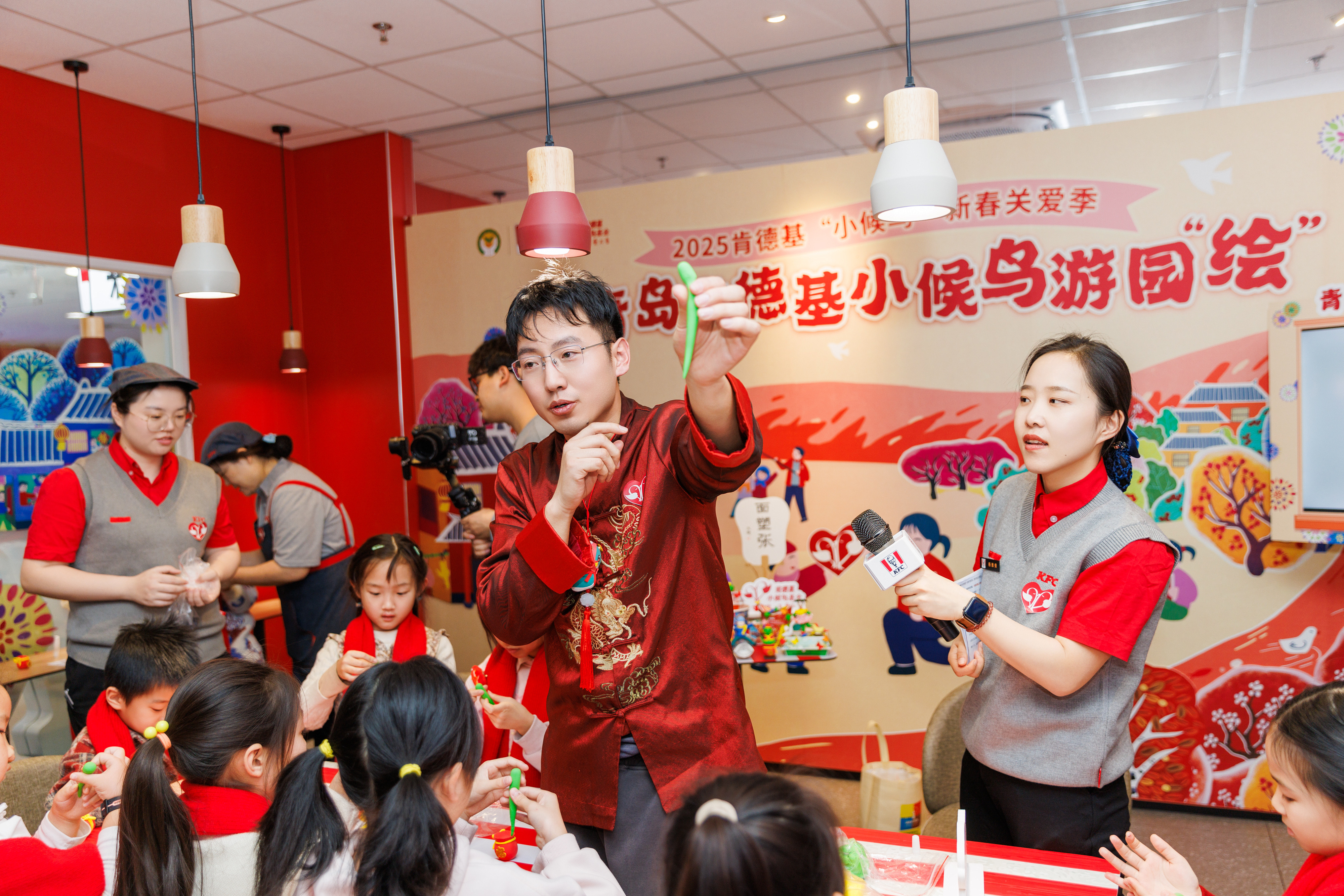 餐厅内处处可见农民画元素的创新演绎,惟妙惟肖的面塑将肯德基新春农民画限定包装装点得生动有趣。现场,青岛非遗面塑传承人张世建老师带领孩子们捏面塑小蛇,感受非遗文化魅力。