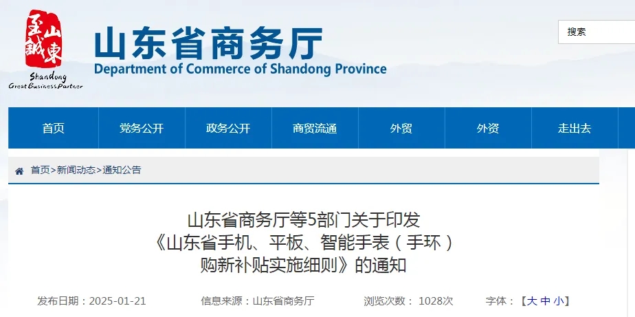 1月21日,山东省商务厅网站发布山东省商务厅等5部门关于印发《山东省手机、平板、智能手表(手环)购新补贴实施细则》的通知。