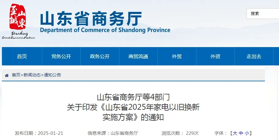 1月21日,山东省商务厅网站发布山东省商务厅等4部门关于印发《山东省2025年家电以旧换新实施方案》的通知。