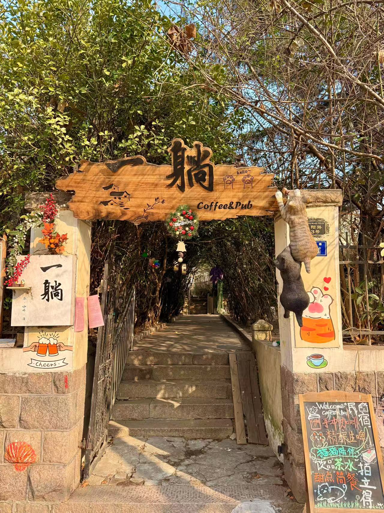 一躺Coffee & Pub,地址:市南区莱阳路53号,营业时间11:00—03:00,地铁3/4号线人民会堂站C出口。