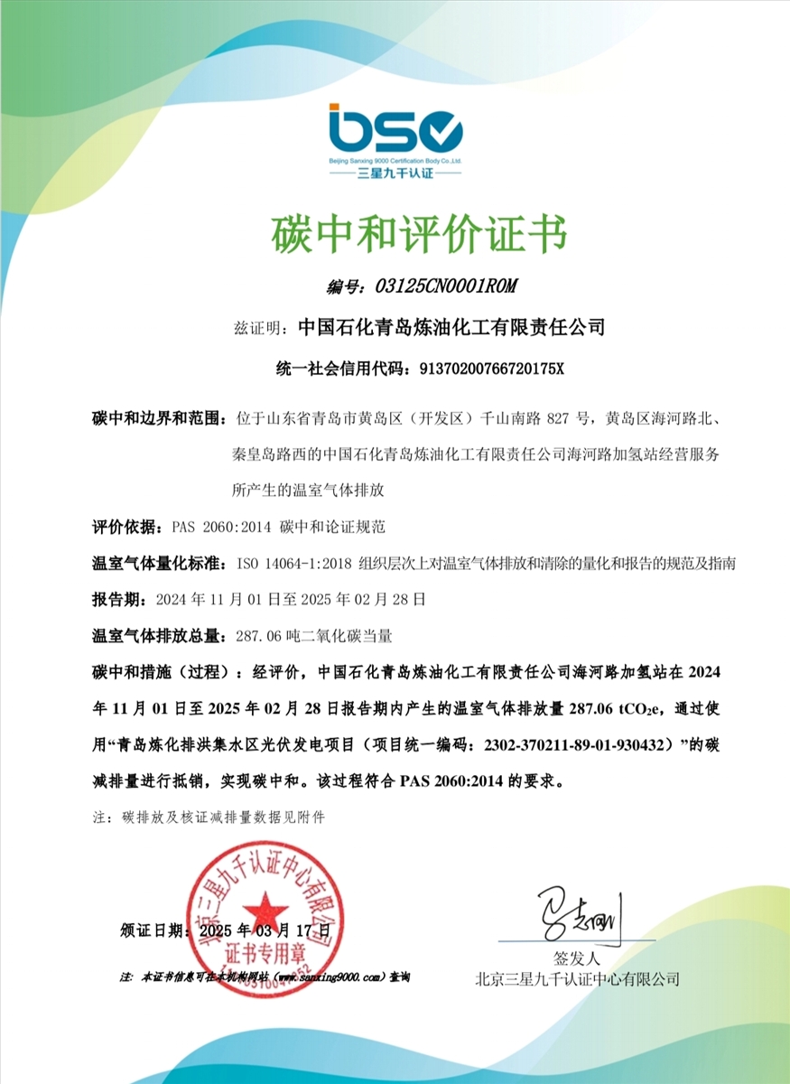 青岛炼化公司海河路加氢站于3月17日通过权威机构评价,获得“碳中和”证书,成为我国首座“碳中和”加氢站。