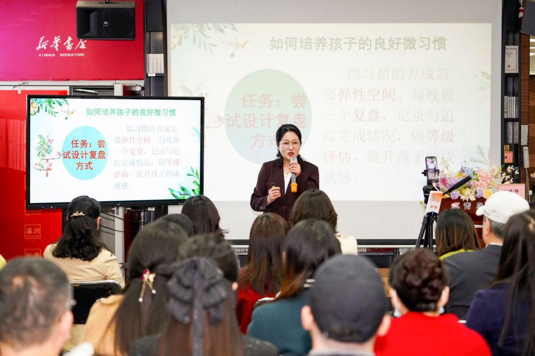 刘老师通过层层推进的方式,讲解了微习惯的脑科学原理和养成策略,通过对200多个家庭的好习惯养成调查问卷、多米诺骨牌实验以及真实案例,生动讲解了微习惯如何从小小的改变最终累积出巨大的能量。现场的师生互动,更是通过实例解读了两分钟习惯培养法则,分享了微习惯养成小组的实践经验,在互动中带动并指导家长如何将奖励方式向着更高层次的精神奖励引导。来自现场的家长,向大家讲解了父辈的榜样力量的传承,让现场听众真切感受到优良家风传承的好习惯,是体现在日常生活的言传身教和一个个细小的行动中。而微习惯养成策略工具箱更是内涵丰富,包含计划制定策略、习惯叠加策略、有效复盘策略。外延深入到促进整个家庭良好氛围的营造,成为家庭好习惯养成的得力助手。