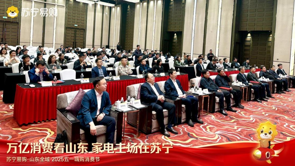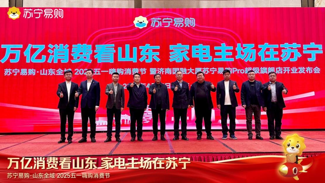 4月15日下午,苏宁易购山东全域2025年“五一嗨购消费节”启动仪式隆重举行。山东省商务厅、市政府、行业协会领导及苏宁易购集团高层共同出席。