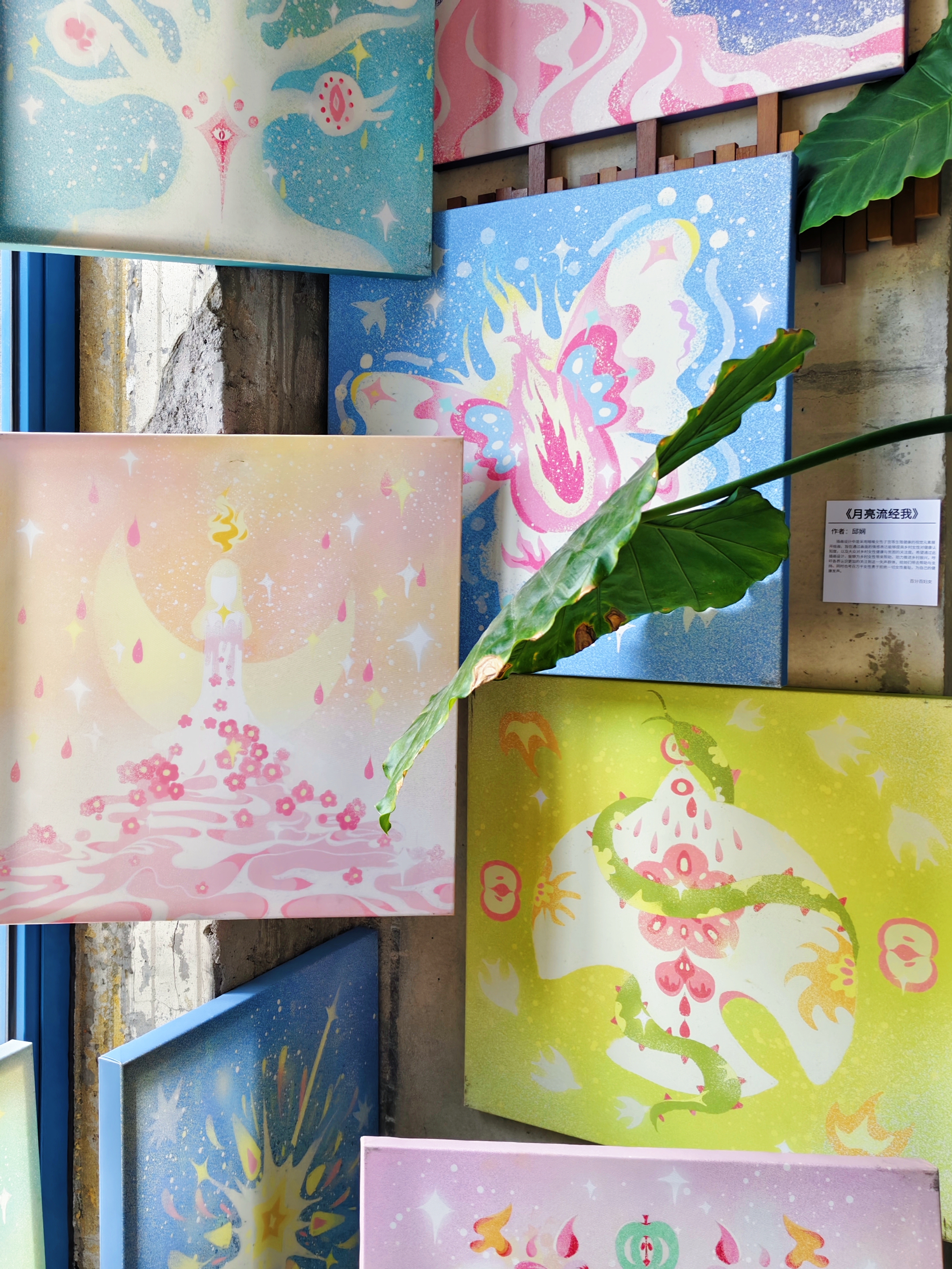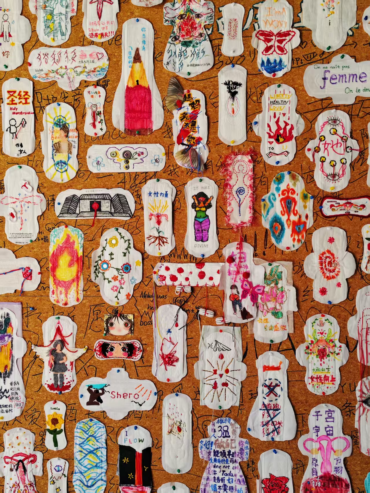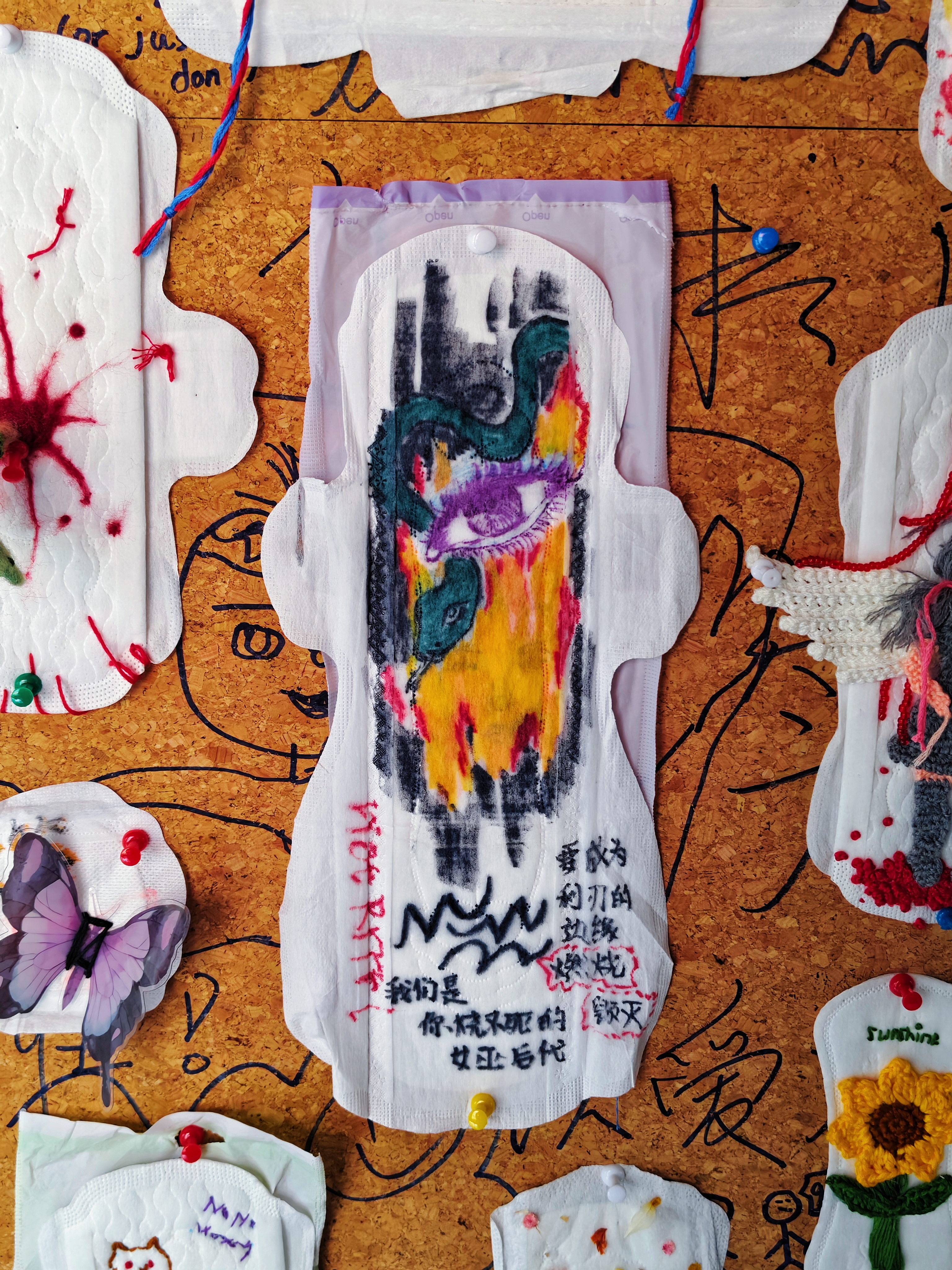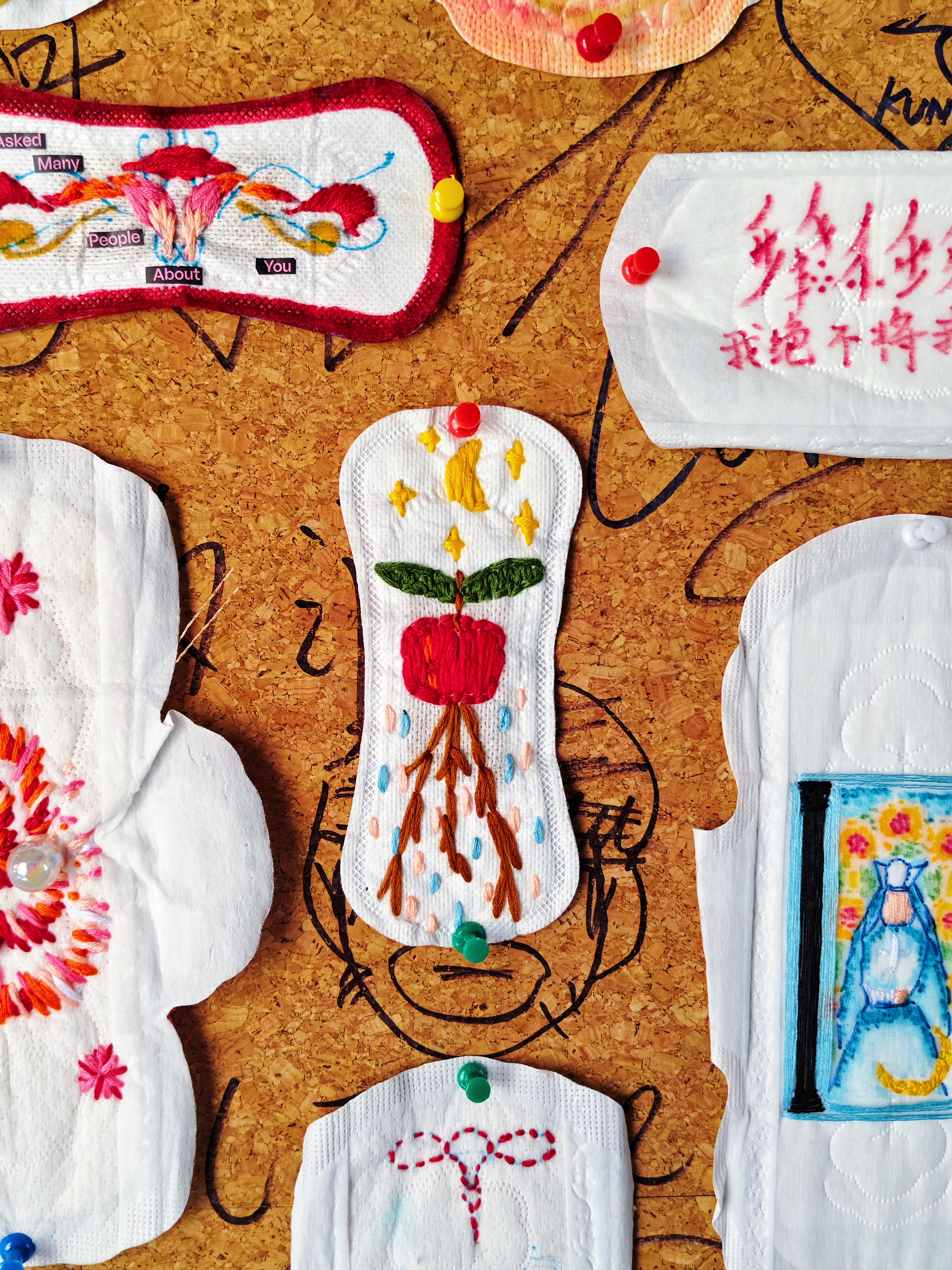 展墙上绣着花朵的卫生巾,绘满故事的棉条,拼贴成画的护垫,都在讲述着女性日常的诗意。