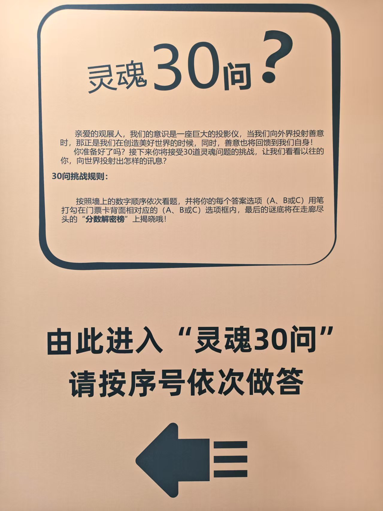 沉浸式观展指南:入场会收到一张特别设计的门票,背面印着30个空白格,穿过布满心理测试题的长廊,趣味问题像一面魔法镜子,让你在互动中重新认识自己。