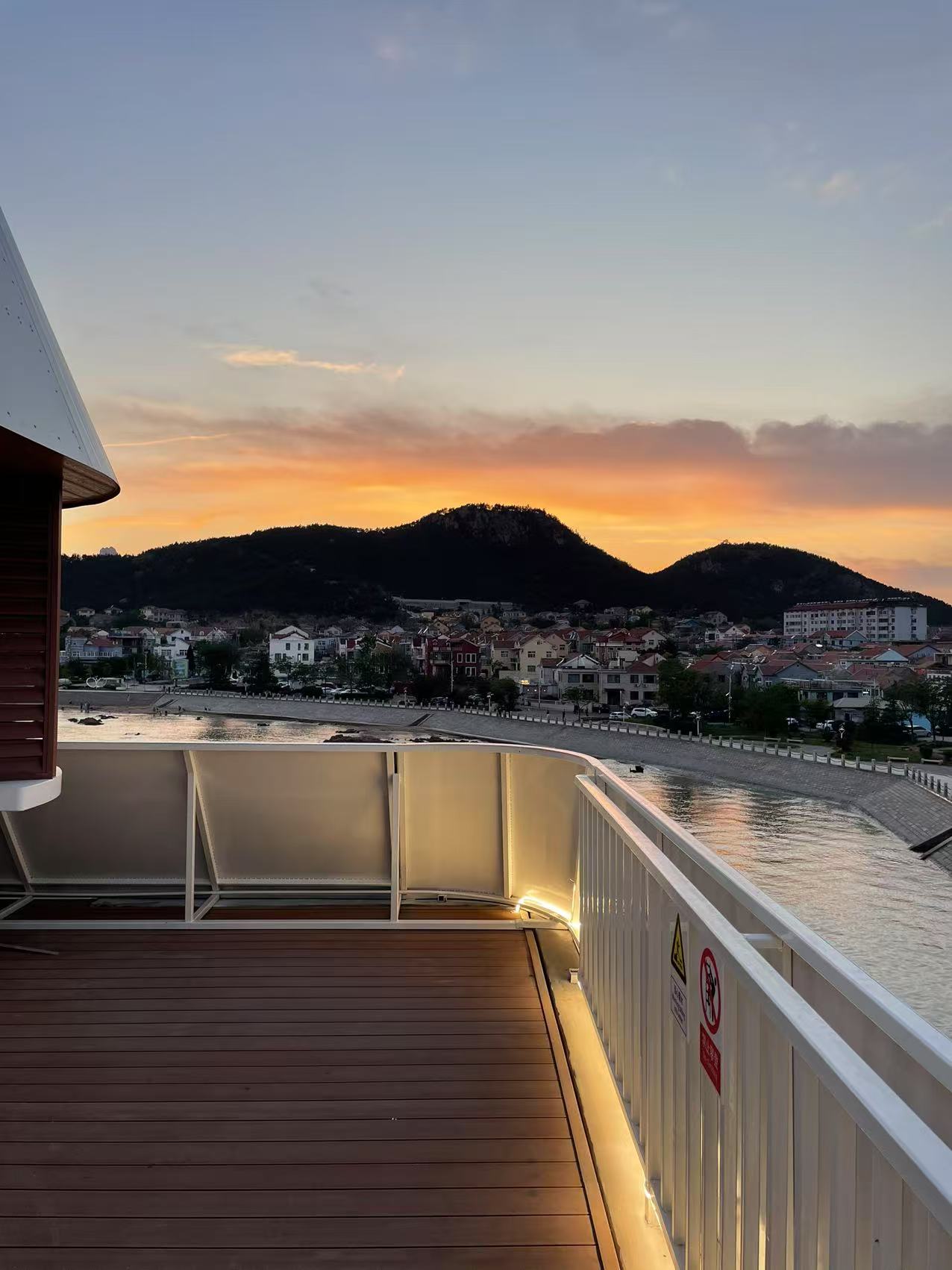 咖啡馆位于会海湾,这里风光绝美,一半是海,一半是山。向东眺望,无垠的海面波光粼粼;向西远观,层峦叠嶂的崂山云雾缭绕;站在甲板上,眼前是一望无际的碧波,远处是连绵起伏的崂山,日出时观海,日落时望山,仿佛时间都慢了下来。
