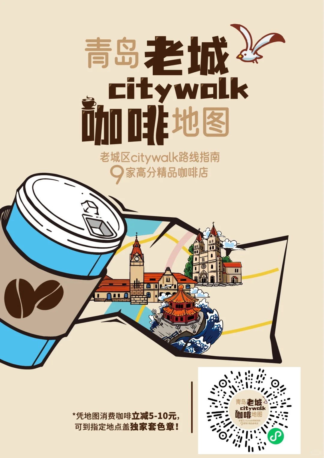 青岛老城citywalk咖啡地图,售价19.9,9家高分精品咖啡店,凭地图消费咖啡享优惠(洛川家咖啡 凭地图可立减10元),“在青岛”粉丝,买地图送徽章活动中,还等什么呢?冲!冲!冲!
