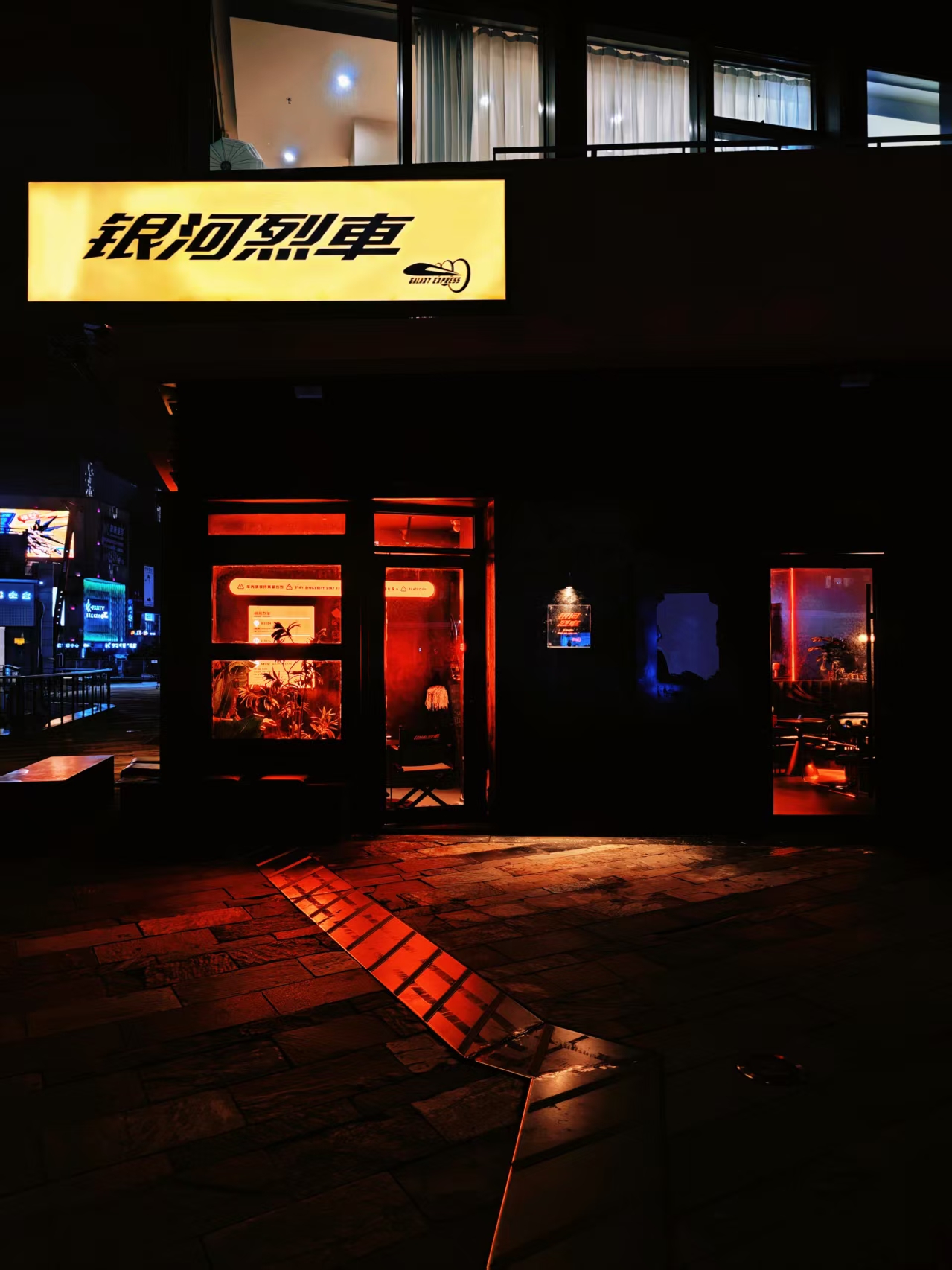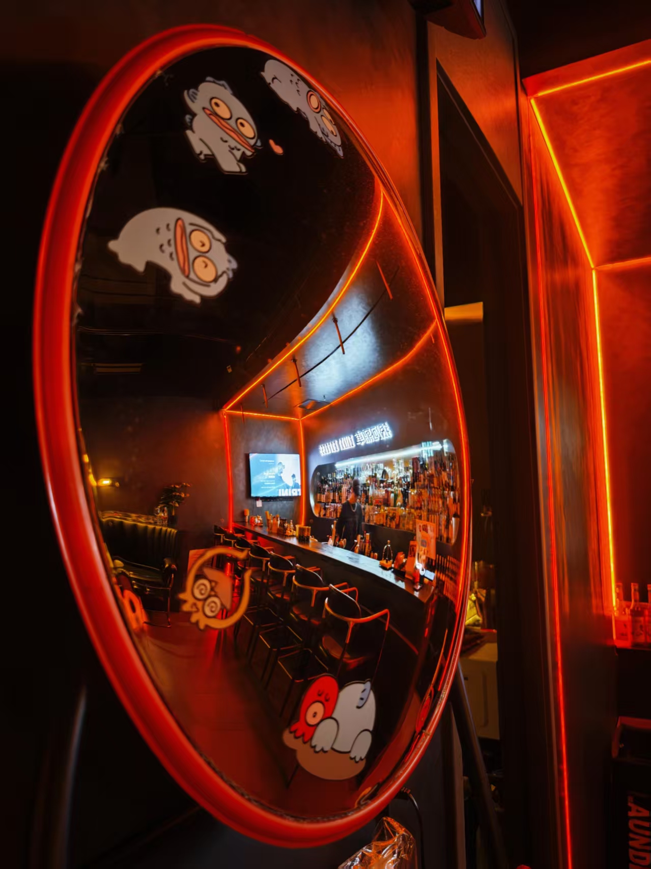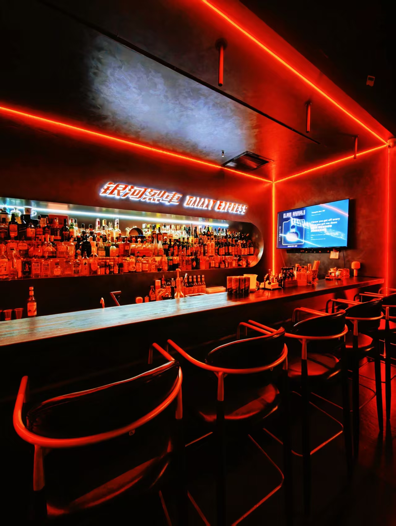 赛博朋克×星际漫游装修美学,推门即穿越,黑橙主色调碰撞霓虹光带,360°环绕座位包裹每一寸神经,吧台化作太空舱操作台——这里不是酒吧,是《银河护卫队》同款星际列车的青岛分车。踏入这里,就像登上了通往宇宙的列车,开启一场奇幻冒险。