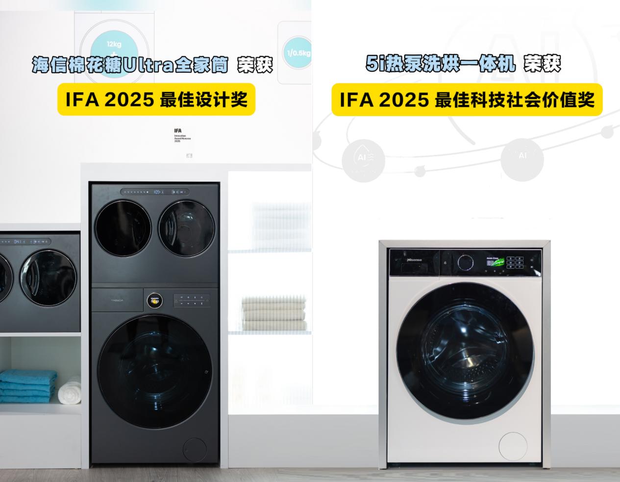 在IFA2025同期召开的第二十一届(2025)中国家用电器创新成果发布盛典上,海信三筒洗衣机(海信棉花糖Ultra全家筒)获得“年度产品创新奖”,其对分区洗护逻辑的彻底重构,赢得了行业和市场的高度认可。同时在2024-2025年度中国家用电器品牌评价活动中,海信洗衣机被中国家电院评为“洗衣机行业十强品牌”。