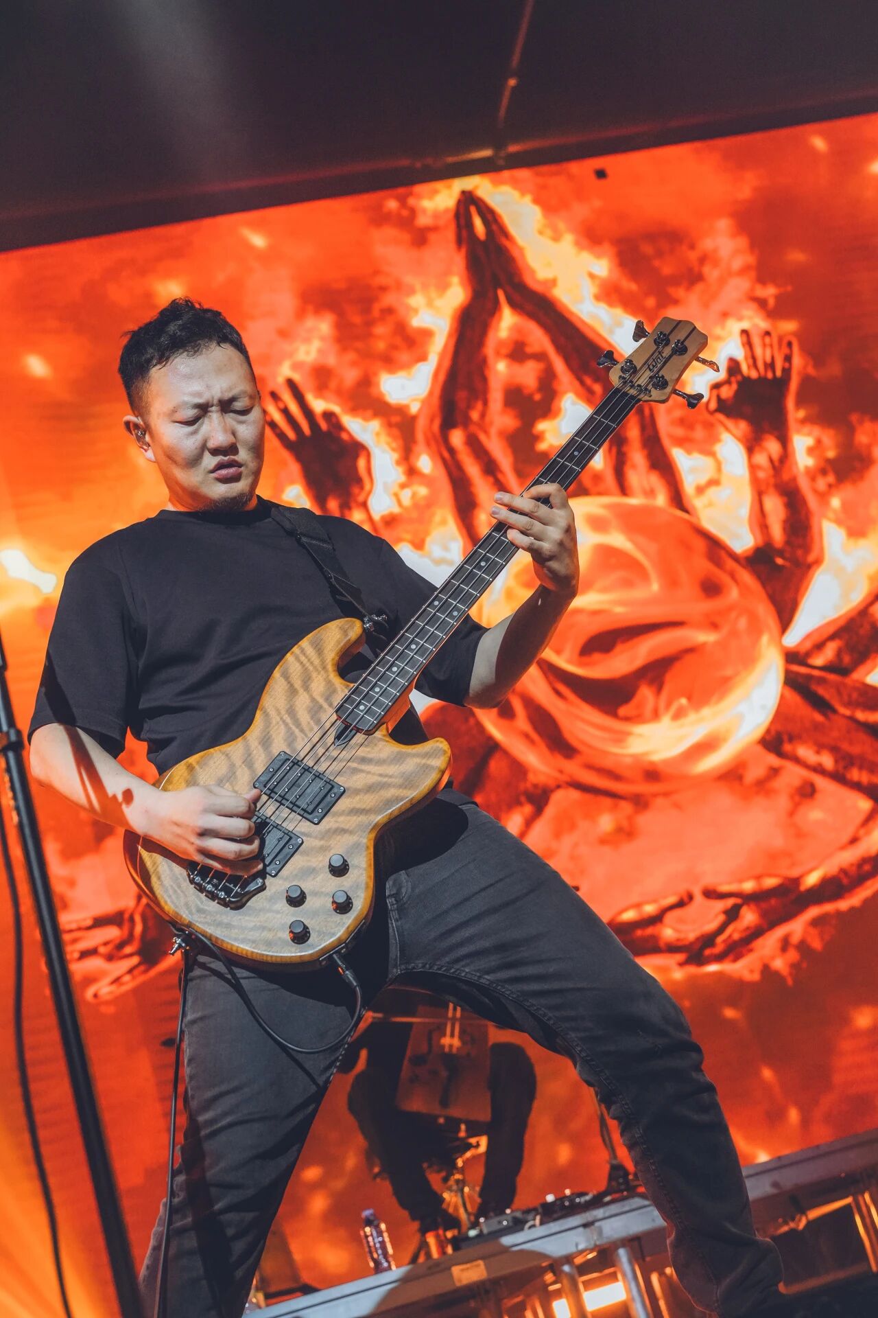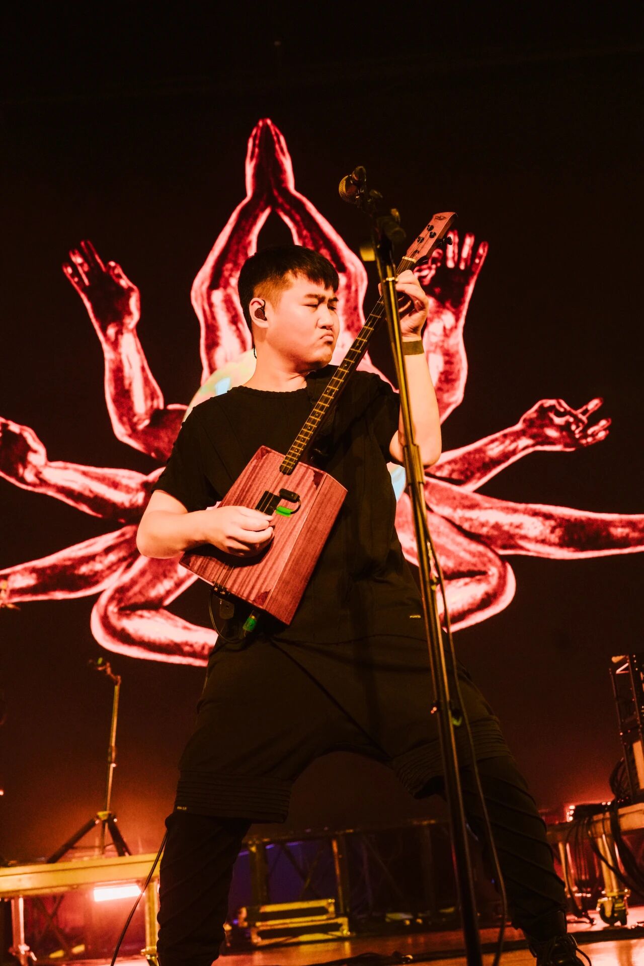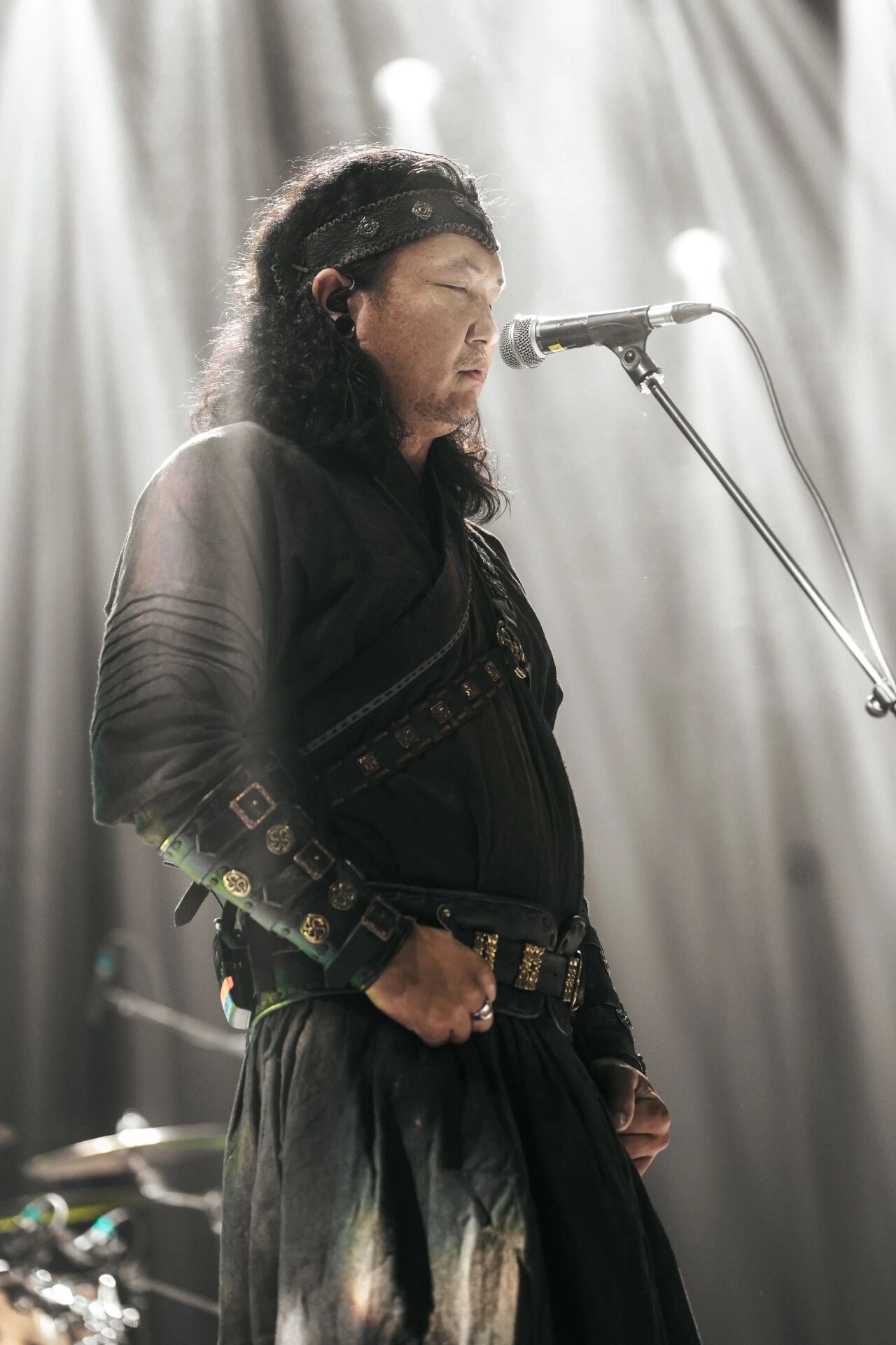 随后灯光骤起,金属共鸣即刻震颤全场,将草原的旷远与摇滚的炽烈无缝融合。主唱高亢嗓音裹挟呼麦的神秘力量穿透声场,每一个肢体动作都诉说着对音乐的赤诚,与强劲节奏共同构筑 「究极之境」 。