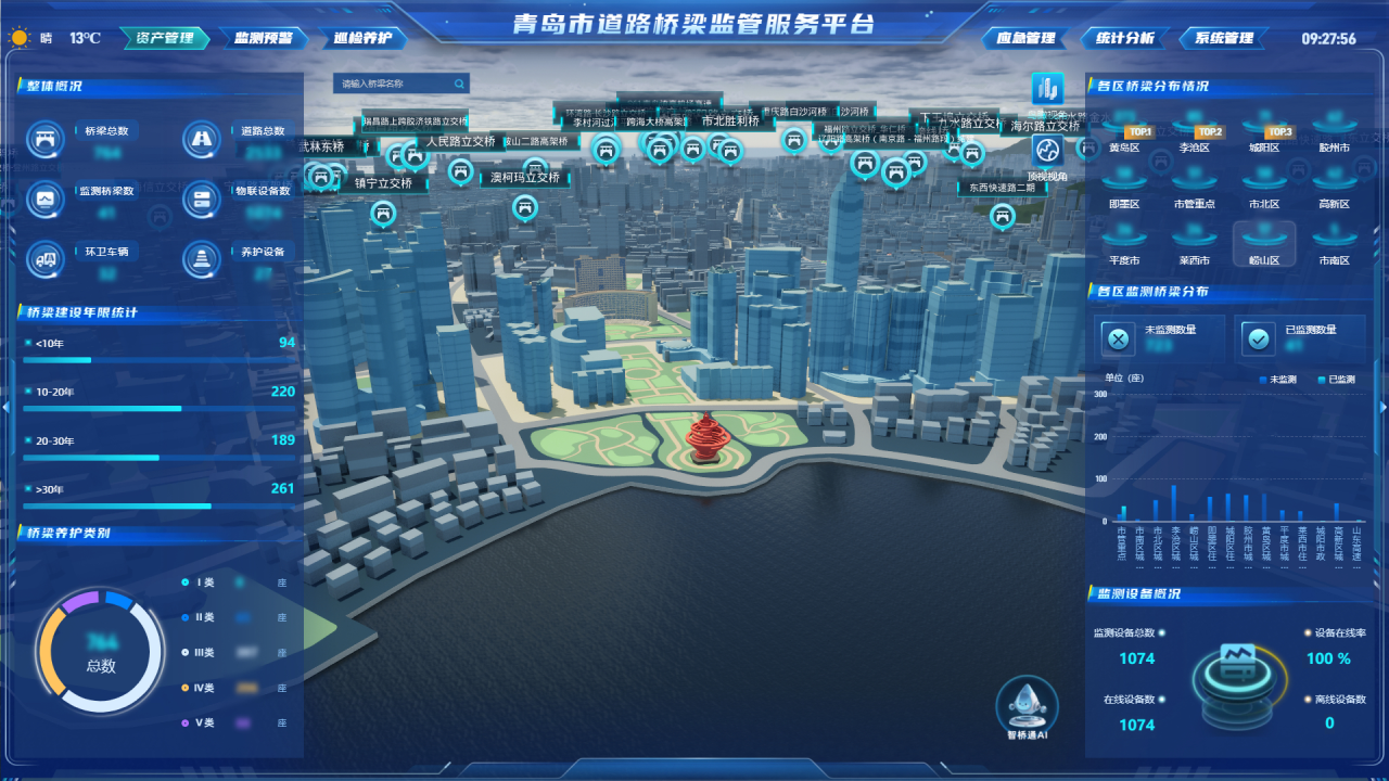 管理创新,开发智慧大脑。依托城市信息模型(CIM),开发建设“青岛市道路桥隧监管服务平台”。该平台将信息模型与桥隧健康监测系统、无人机巡检系统、AI识别系统深度融合,构建“智慧大脑”,收集数据120亿条,自动分析研判,对养护作业提出精准建议和科学技术措施,实现监测实时化、养护标准化、分析自动化、应急同步化、档案规范化,极大提高了全市市政基础设施的管理效能和精细化水平。