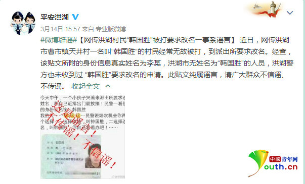 警方的辟谣微博显示,近日,网传洪湖市曹市镇天井村一名叫"韩国胜"的村民经常无故被打,到派出所要求改名。经查,该贴文所附的身份信息真实姓名为李某,洪湖市无姓名为"韩国胜"的人员,洪湖警方也未收到过"韩国胜"要求改名的申请。此贴文纯属谣言,请广大群众不信谣、不传谣。