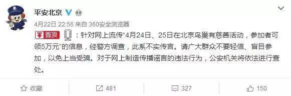 北京市公安局官方微博及微信发布辟谣消息,“针对网上流传‘4月24日、25日在北京鸟巢有慈善活动、参加者可领5万元’的信息,经警方调查,此系不实传言。请广大群众不要轻信、盲目参加,以免上当受骗。对于网上制造传播谣言的违法行为,公安机关将依法查处”。此消息一发出,深圳、天津、河北等多地公安部门纷纷跟进转发,进行辟谣。