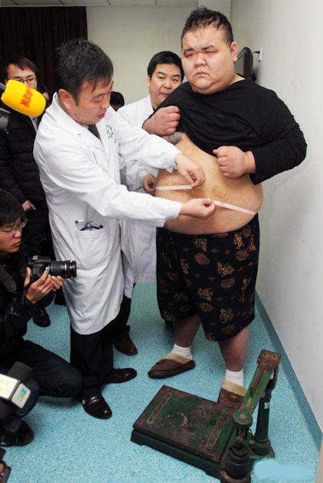 2012年12月25日,西安,手术后的超级肥胖症患者在医生监督下,称重233公斤,比入院前少16.5公斤。量体腰围1.5米,比入院前少0.18米。体重只有94斤的女朋友对体重499斤的曾华(化名)来说就像个小孩。