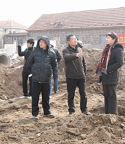 刘昌文(中)与同事一起查看崂山路一期工程工地(资料图片)。