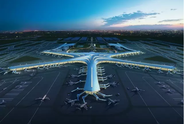 青岛新闻网1月11日讯 青岛新机场位于胶州市中心东北,距离青岛市中心39公里。新机场采用集中式单元五指廊造型的航站楼,以“齐”字状为总体布局,是全国首个集高铁、地下铁穿通过的机场航站楼,可以实现1小时通达青岛全域、1.5-2小时覆盖半岛主要城市。新机场于2015年开工建设,计划2019年上半年转场运营,航站楼建筑面积47.8万平米,运营初期预计旅客吞吐量约为2600万人次。