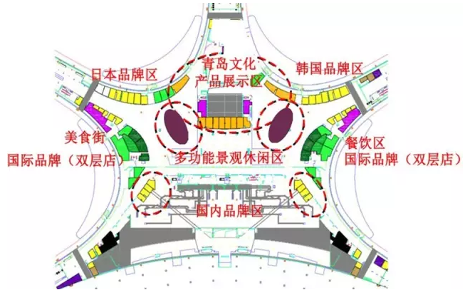 布局特色。布局规划集中商业区,以美食街、手信街、国际街、商贸街四大各具特色的集中商业区为主,按照旅客动线分布于航站楼,满足旅客就餐、购物、休闲、娱乐需求。