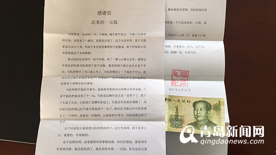 时隔一年,2017年2月13日,几经询问的他才找到113路车所在的车队,并将迟到的一元钱连同表扬信送到路队,并将这一元钱送给司机师傅。信中称:“一年来总觉得‘有些事情没做’,最后才想起我没给车费,一元钱虽然不多,可是这一元钱很重。”