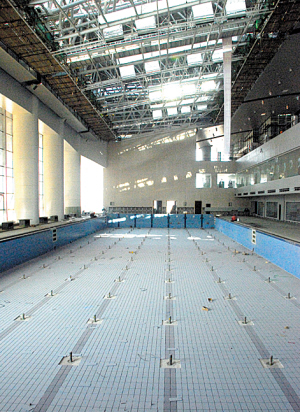 由于正在进行各类性质不同的交叉作业,馆内显得有些凌乱,但游泳比赛池、游泳训练池和跳水池三座水池已基本成型。尤其是位于比赛区侧方的游泳训练池,已完全完成瓷砖镶贴工作,而游泳比赛池的瓷砖镶贴工作也于日前启动,目前两侧池壁已贴满了浅蓝色的瓷砖。
