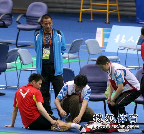 全运预赛夏煊泽受伤 夏煊泽给伤处喷药 陈书佳/摄