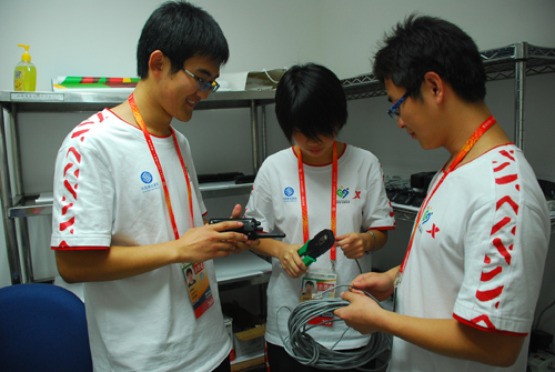恰逢各参赛队赛前训练,大量细微的工作需要志愿者们认真落实,仔细检查,有时候需要根据情况的变化将已经费力完成摆设的物件重新归位分配。从一丝不苟地固定场地细缆,到校对放置的隔离带是否齐整;从整理分发繁杂的竞赛资料,到斟酌安排坐区和座椅的位置。他们往返于暖湿的竞赛内场和清冷的场外库房,一遍遍与主管老师讨论征询相关事宜,一次次向代表队详解具体安排。他们谨慎地思考着每一处细节,争取为他人服务到最好。组员赵宇这样评价自己的工作:“我相信,所有的问题会在全体竞赛组织部同仁的努力下不断被发现、总结,并得到妥善的解决!”