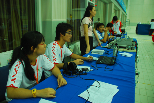 橙白橙绿白蓝蓝白绿棕白棕,这是技术保障部安网线时排线的口诀。刚上岗,一堆各种颜色的电线便给了这群从未真正接触过此项工作的男孩女孩一个下马威。首先要记住口诀,其次要相互协调布线,任何一个疏漏都会都会导致网络的不通畅,因而所有人都不敢有丝毫马虎。上午刚刚学会如何布线,下午便进行实训,两人一组,他们相互协调,互相磨合,用最少的资源满足最大的需求。布完线后,为使整个房间看起来美观整齐,还要按照审美需要将电线排列,从而给所有参与全运会的人员以美的享受。“在这美丽的贝壳馆里,舞动的身姿并不只有运动员们,一定还会留下我们技术保障部志愿者们舞动的风采。”技术保障部的林繁荣这样说到。