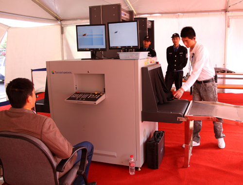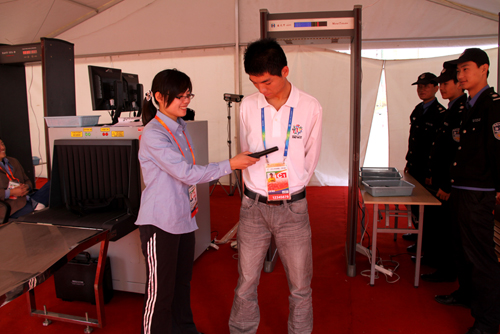 图为十一运会青岛赛区男子B组小组赛所在地——中国石油大学体育馆(黄岛校区)的安检人员对进入比赛场馆的每位人员,都严格进行认真仔细的安保检查,以保证比赛的安全进行。(杨晓菁摄影报道)