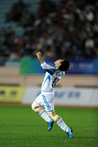 10月27日,辽宁队球员马晓旭在进球后欢呼。当日,在山东省青岛市举行的第十一届全国运动会足球女子成年组决赛中,辽宁队以1比0战胜江苏队,获得冠军。