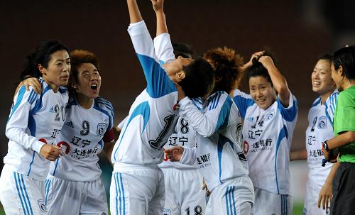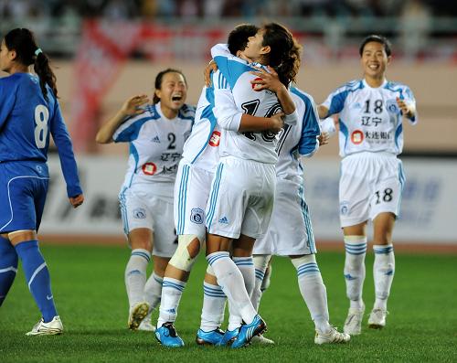 10月27日,辽宁队球员们在获胜后相拥庆祝。当日,在山东省青岛市举行的第十一届全国运动会足球女子成年组决赛中,辽宁队以1比0战胜江苏队,获得冠军。