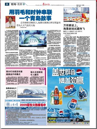 他试图呈现一个不一样的大海:“之前海南岛已经拥有自己的海景实景演出,但在我看来,它所表现的,是对大海辽阔的感受,而我们更多追求的是细节的浪漫,在海南感受到的海景肯定和青岛有所不同,因为我们的海与城市紧密结合,它是富有现代感和人文气息的。而从演出环境来看,海南的海景着重描摹沙滩,而我们要展现的是港口文化、栈桥文化,它具有更多的人文色彩。”