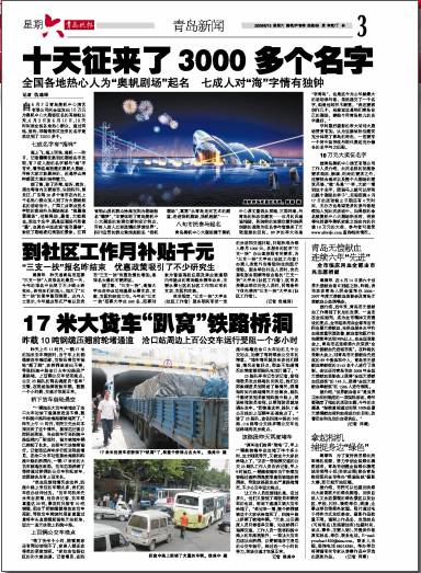 自6月2日青岛奥帆中心演艺有限公司向全国发出10万元为奥帆中心大剧场征名的英雄帖以来,6月3日至6月12日,10天时间里全国各地热心群众,通过网络、信件、邮箱等形式送来的名字竟然达到了3000多个。