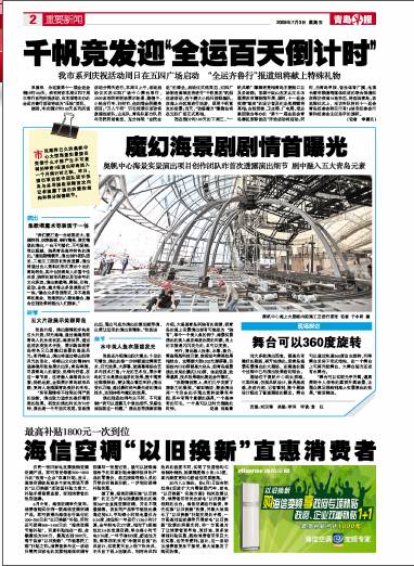 张良还介绍演出四大看点:十足的可看性,演出的每一分钟都通过舞美艺术、灯光效果、大屏幕、玻璃幕等综合艺术与技术打造;十足的艺术性,展示青岛的文化是演出追求的效果;整个观赏过程很轻松,要让观众看后叫好;演出变化万端,通过最时尚与最先进的演出技术,达到神奇与魔幻的效果。