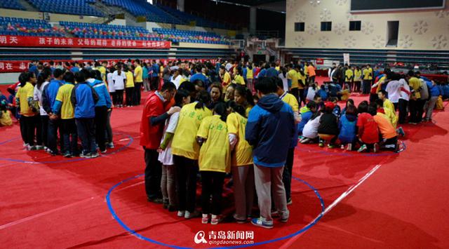 活动开始时,老师、父母和学生被主办方分到不同的小组,穿上不同颜色的统一服装,通过游戏和完成任务的方式,让父母与孩子体验与陌生人交往的感觉。在打招呼、画“井”字、家庭环境模拟等活动中,参与者和组织者互动频繁,俨然将海大的体育馆变成了热闹非凡的游乐场,每个人脸上都洋溢着笑容。