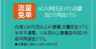 4G入网狂扫送3个G流量,加2元再送2个G。