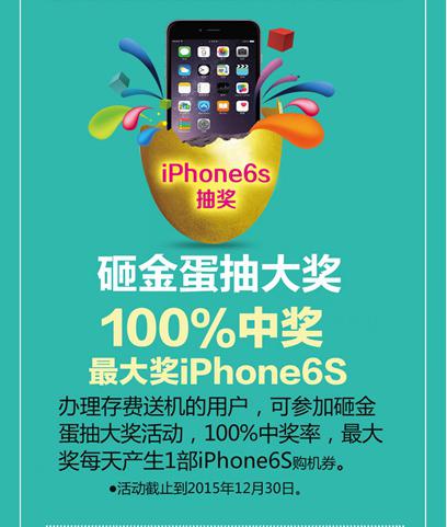 另外,办理存费送机的用户,可参加砸金蛋抽大奖活动,100%中奖率,最大奖每天产生一部iphone6s购机券。