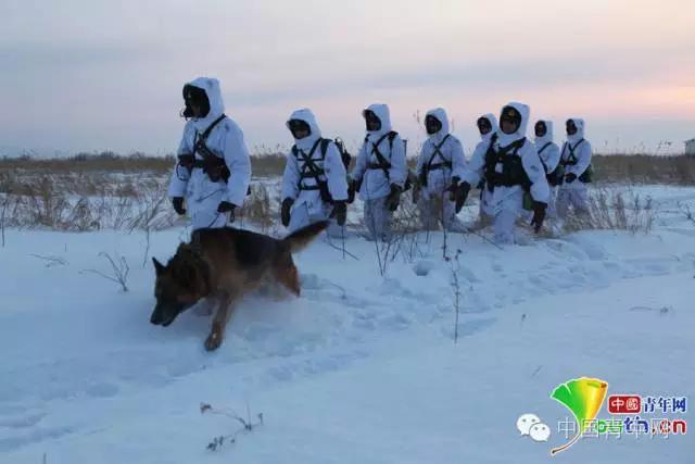 冬季巡逻路上,积雪没过战士的膝盖。军犬四肢深陷雪中,艰难行进。