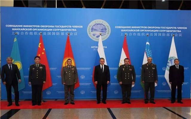 2016年6月8日,在哈萨克斯坦阿斯塔纳,中国国务委员兼国防部长常万全(左二)与其他与会代表合影。新华社记者 苗壮 摄