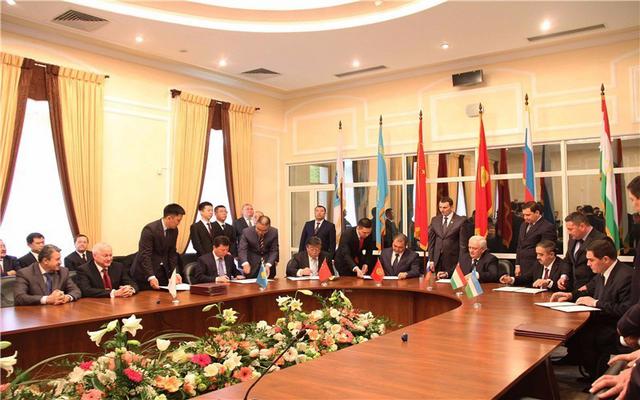 2016年4月8日,在乌兹别克斯坦首都塔什干的上海合作组织反恐怖机构执委会大楼,各国代表团团长参加文件签字仪式。新华社记者沙达提 摄
